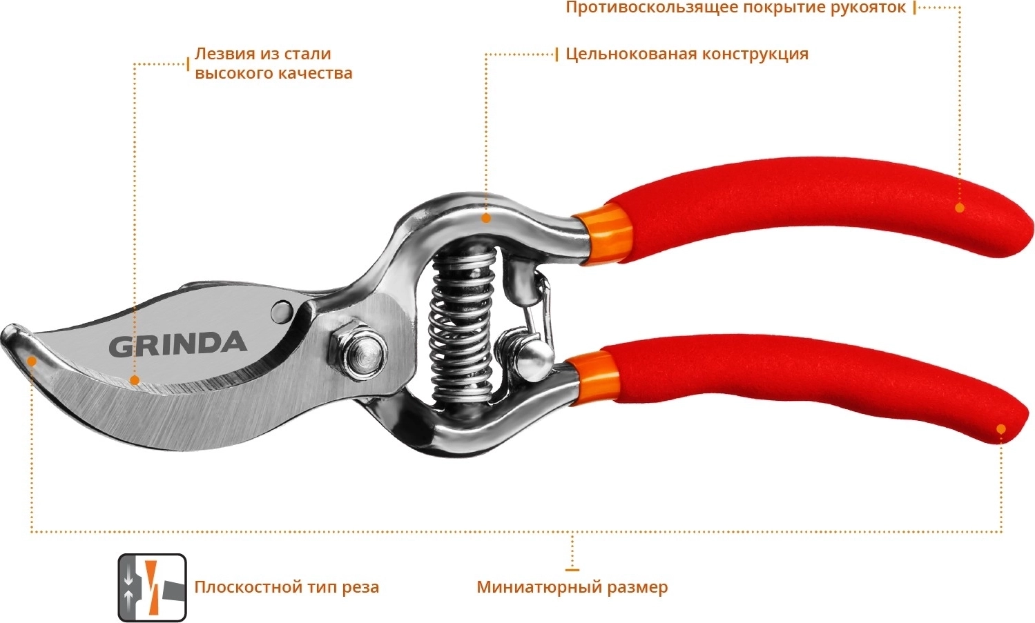 Все секаторы GRINDA являются прочными, долговечными и удобными изделиями, обеспечивая комфортный и лёгкий рез. Они выполнены из высококачественных материалов гарантирующих долгий срок эксплуатации.