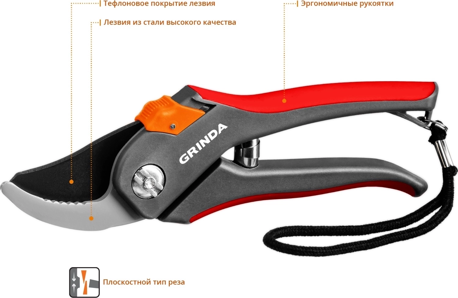 Плоскостной секатор GRINDA G-26, 205 мм, углеродистая сталь, закаленные лезвия, тефлоновое покрыт., двухкомпонентные пластиковые рукоятки