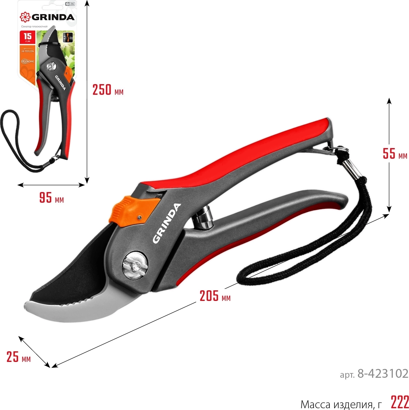 Все секаторы GRINDA являются прочными, долговечными и удобными изделиями, обеспечивая комфортный и лёгкий рез. Они выполнены из высококачественных материалов гарантирующих долгий срок эксплуатации.