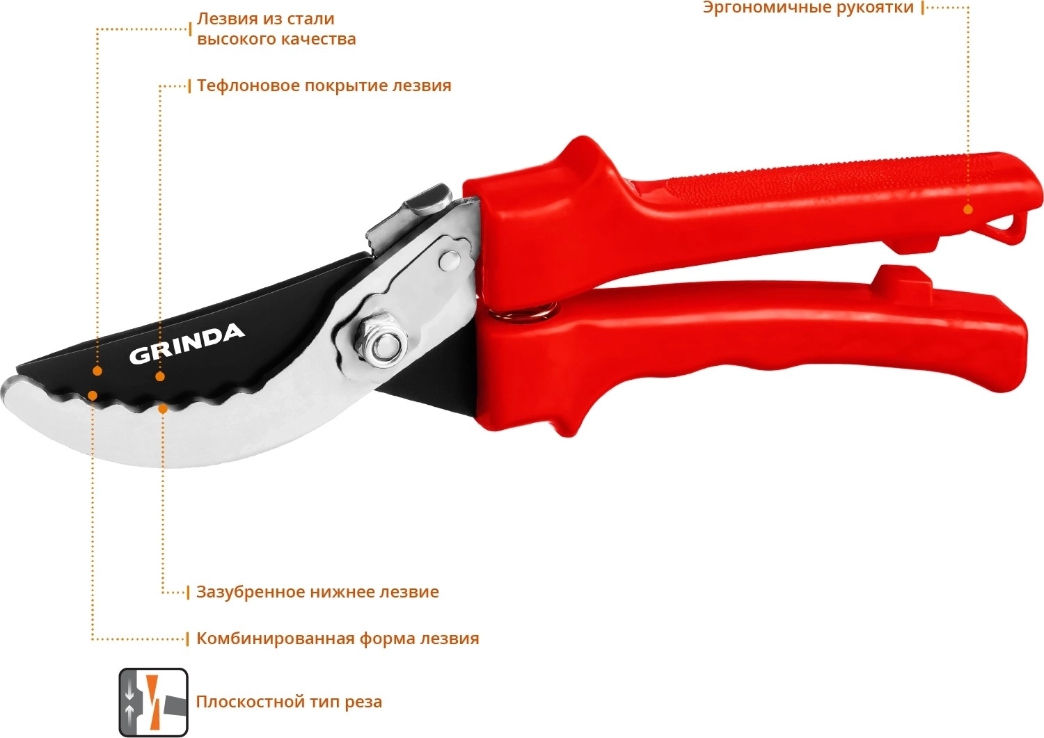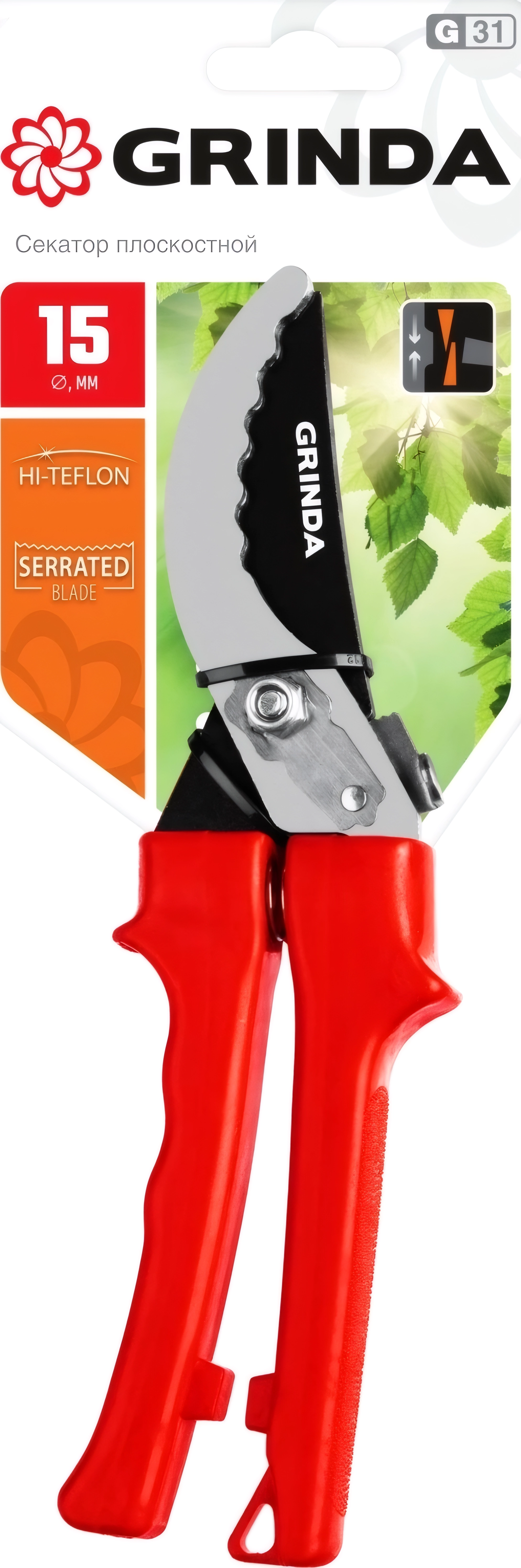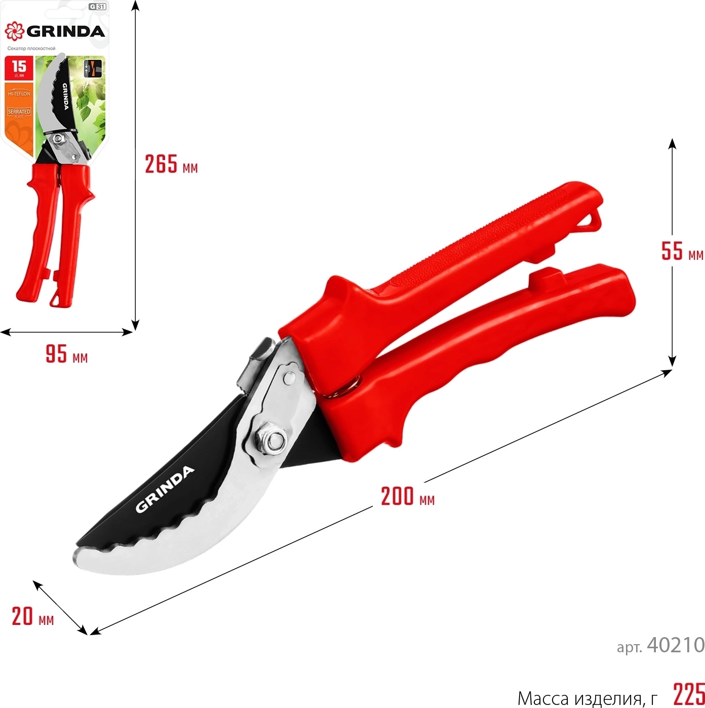 Плоскостной секатор GRINDA G-31, 200 мм, закаленные лезвия, тефлоновое покрытие, зубцы на лезвии, пластиковые рукоятки