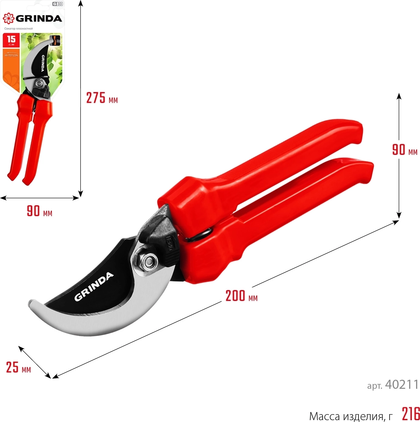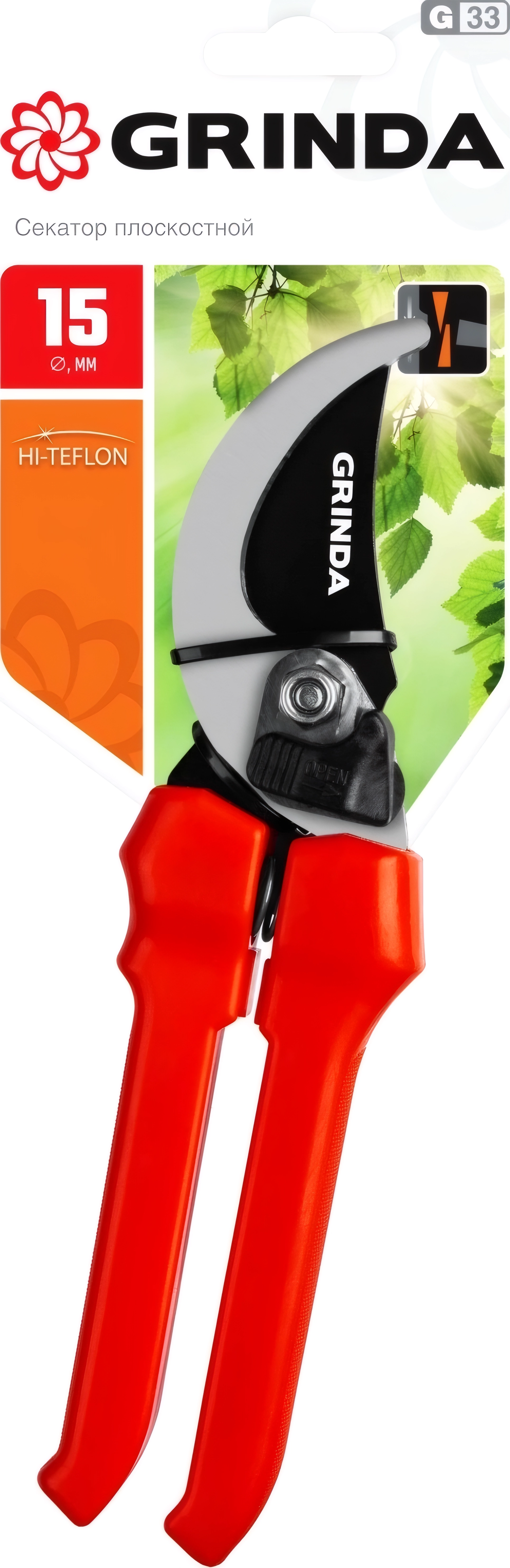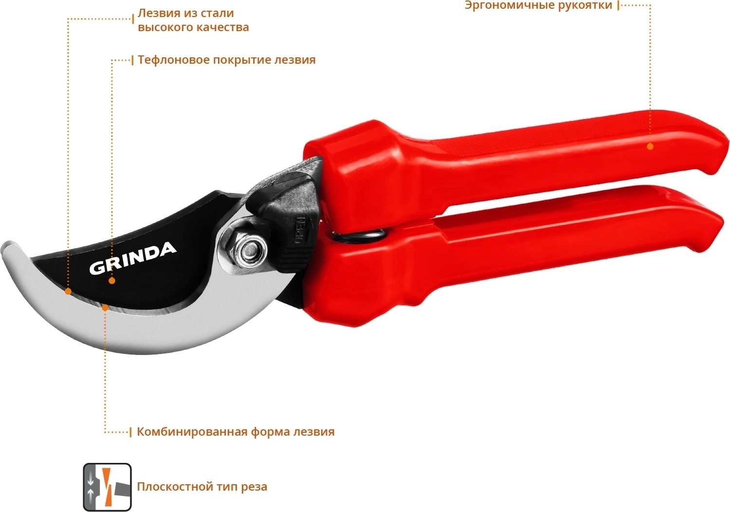 Плоскостной секатор GRINDA G-33, 200 мм, закаленные лезвия, тефлоновое покрытие, пластиковые рукоятки