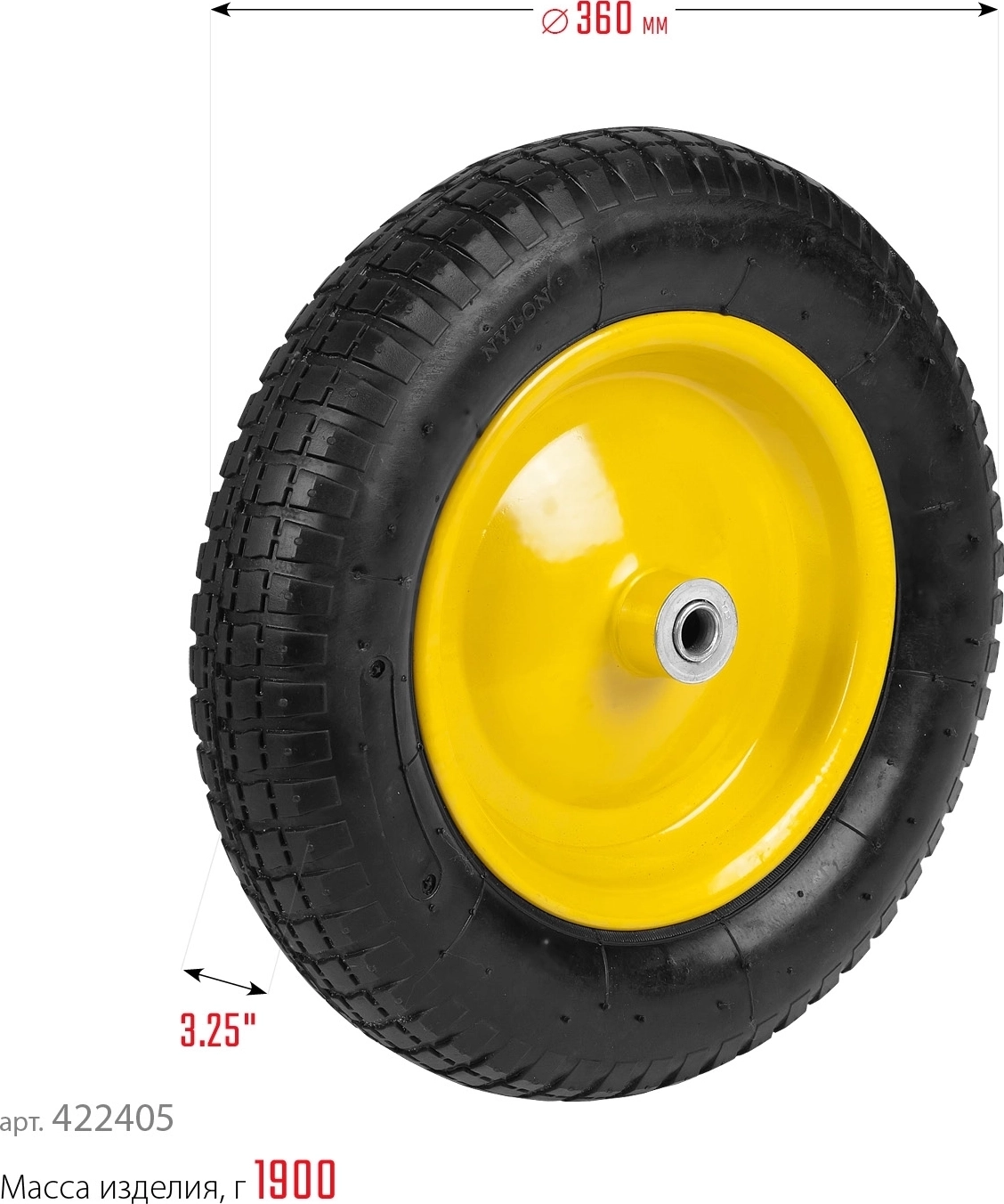 Пневматическое колесо для тачек GRINDA WP-16 3.25" x 360 мм, стальной диск, подшипник 16 мм