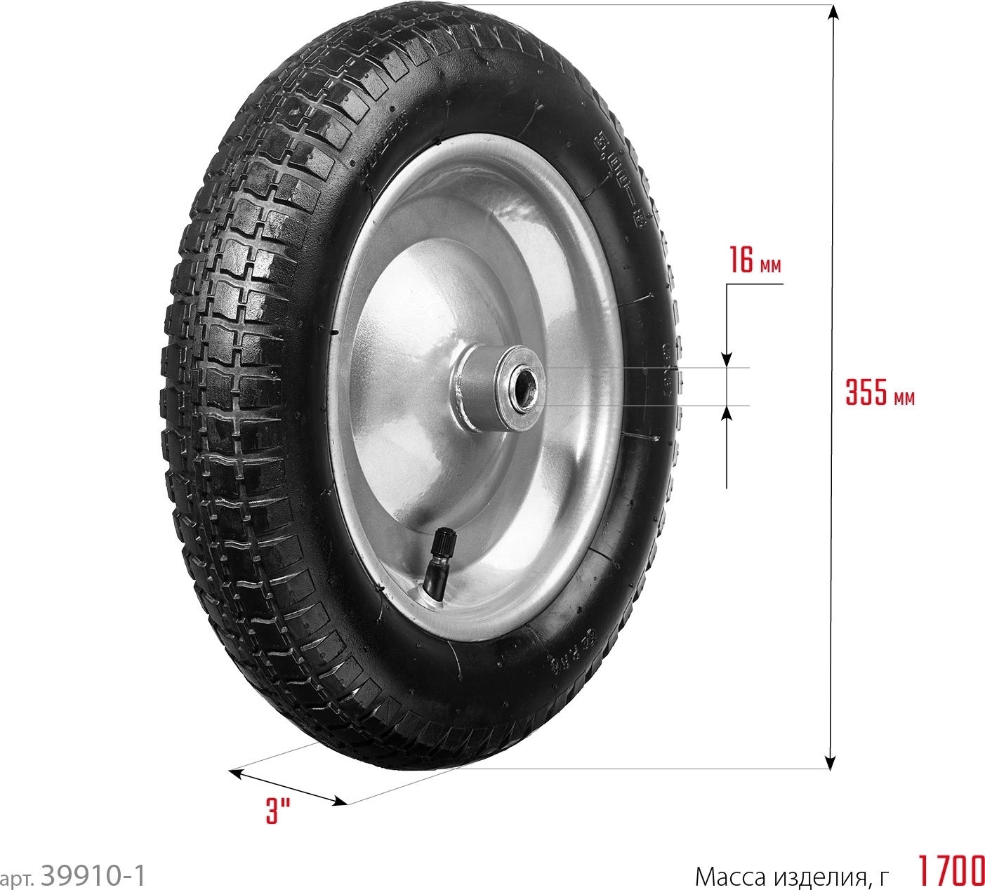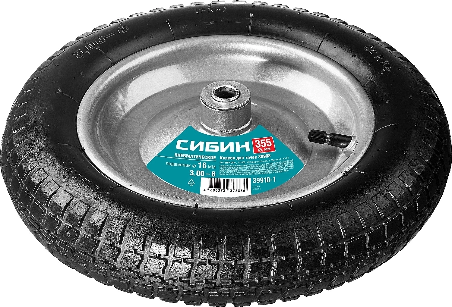 Пневматическое колесо для тачек СИБИН СК-1 3" x 355 мм, стальной диск, подшипник 16 мм