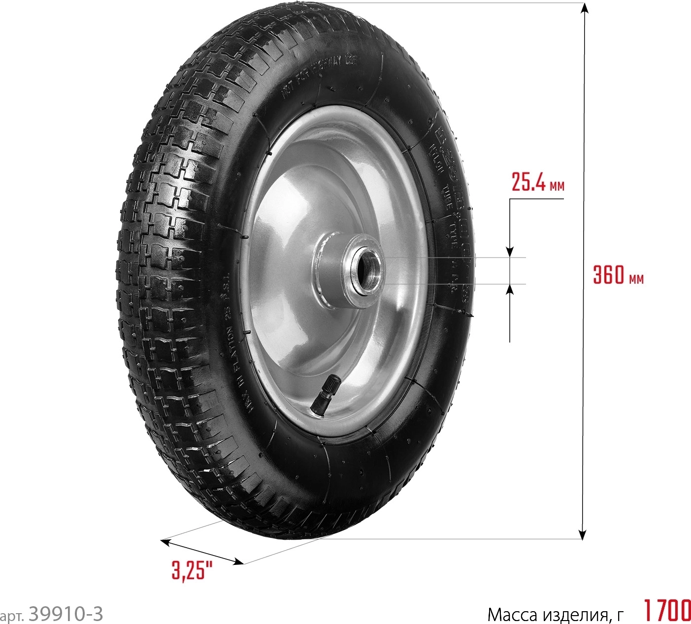 Пневматическое колесо для тачек СИБИН СК-3 3.25" x 360 мм, стальной диск, подшипник 25.4 мм