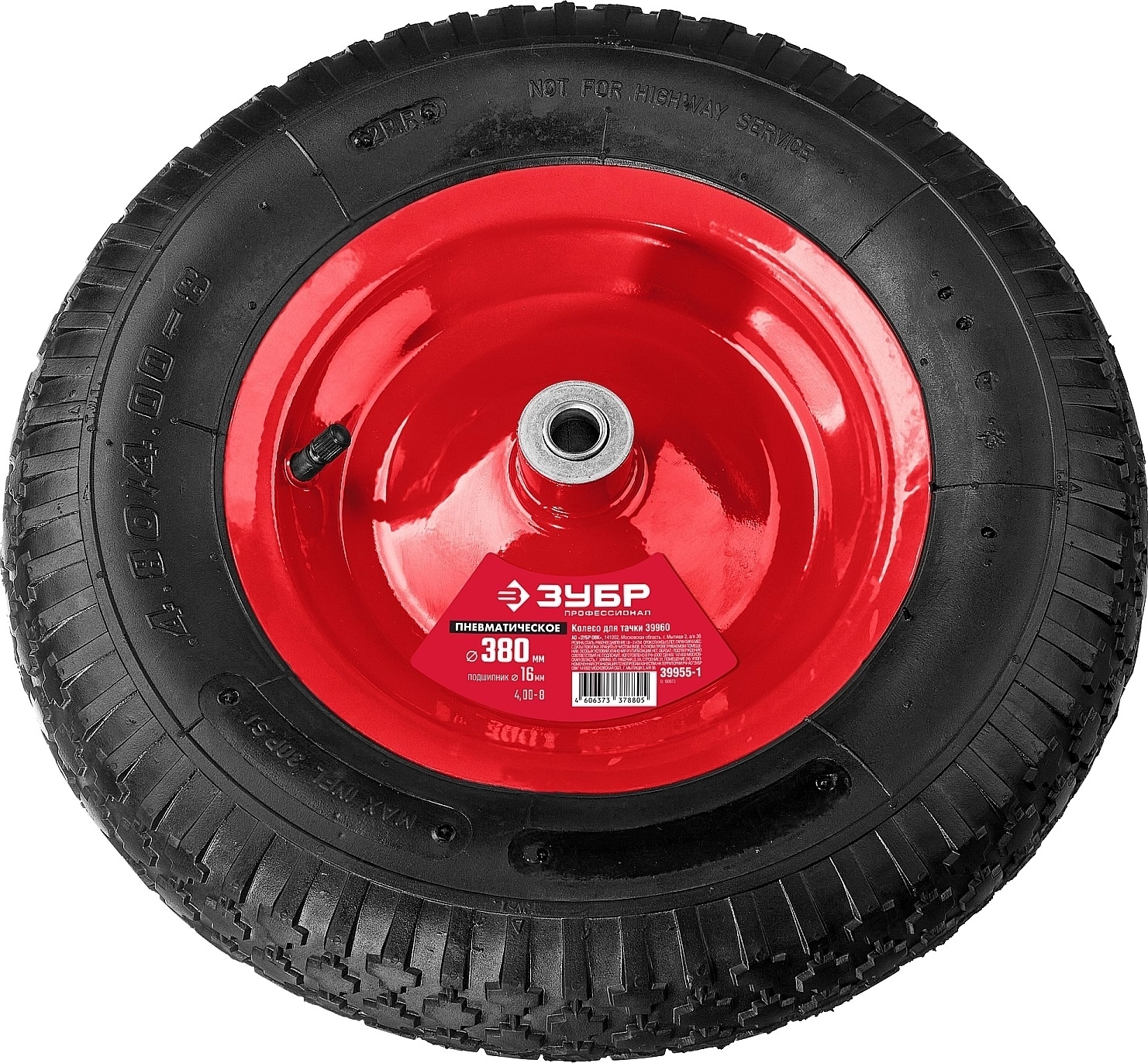 Пневматическое колесо для тачек ЗУБР КП-1 4" x 380 мм, стальной диск, подшипник 16 мм