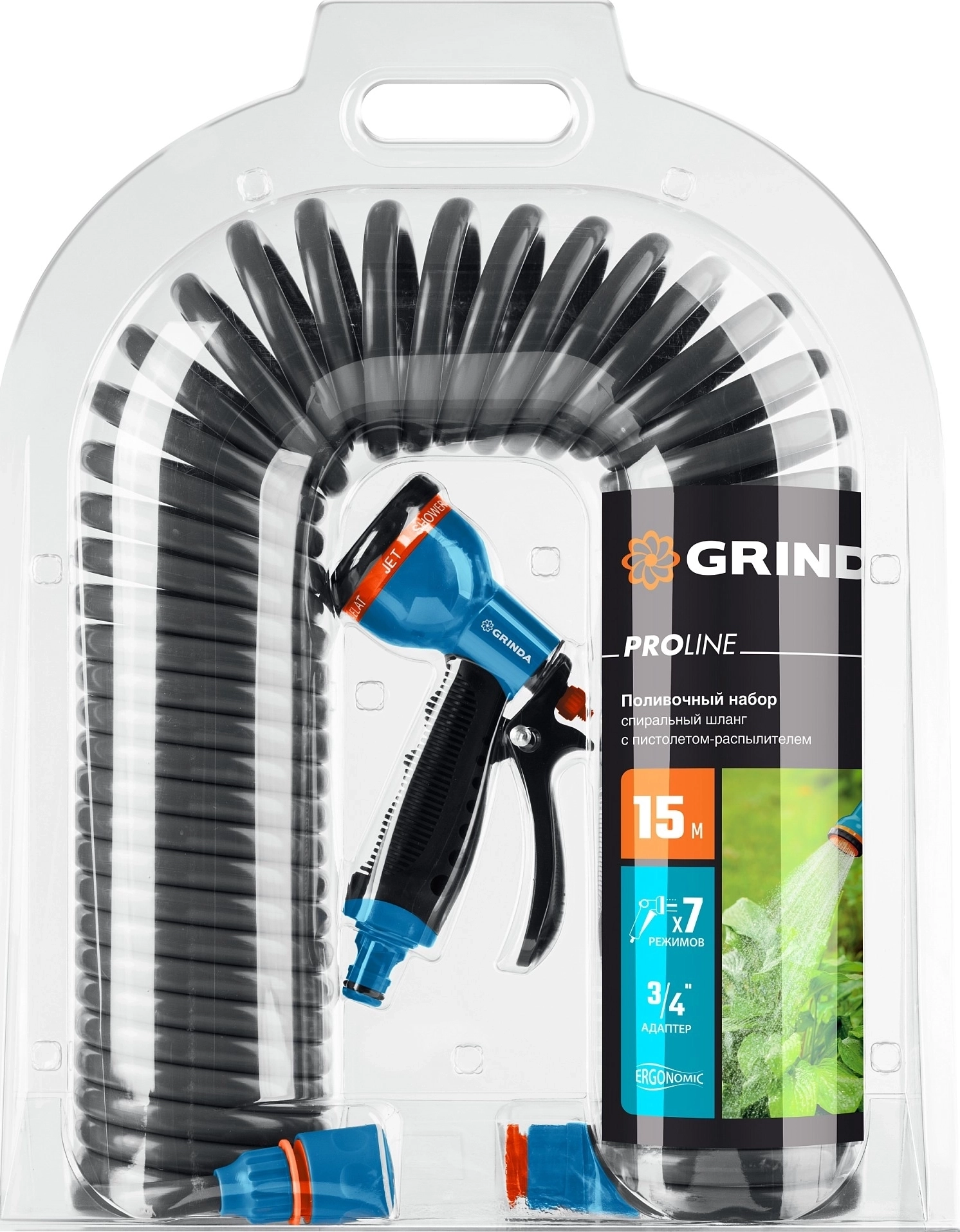 Поливочный набор PROLine GRINDA спиральный шланг 3/8″ x 15 м пистолет-распылитель адаптеры