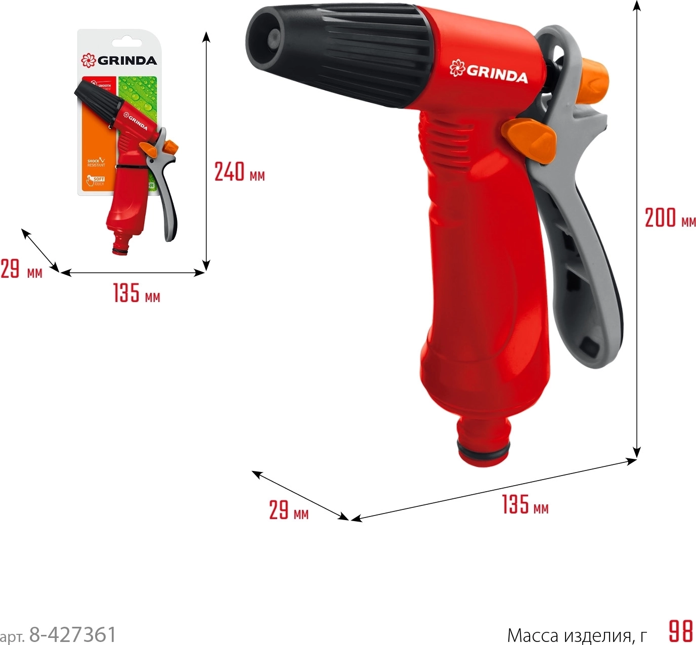 Поливочные пистолеты-распылители GRINDA удобны, надёжны и долговечны. Обеспечивают простое и качественное подключение к поливочной системе. Широкий модельный ряд с самыми современными и эффективными режимами полива.