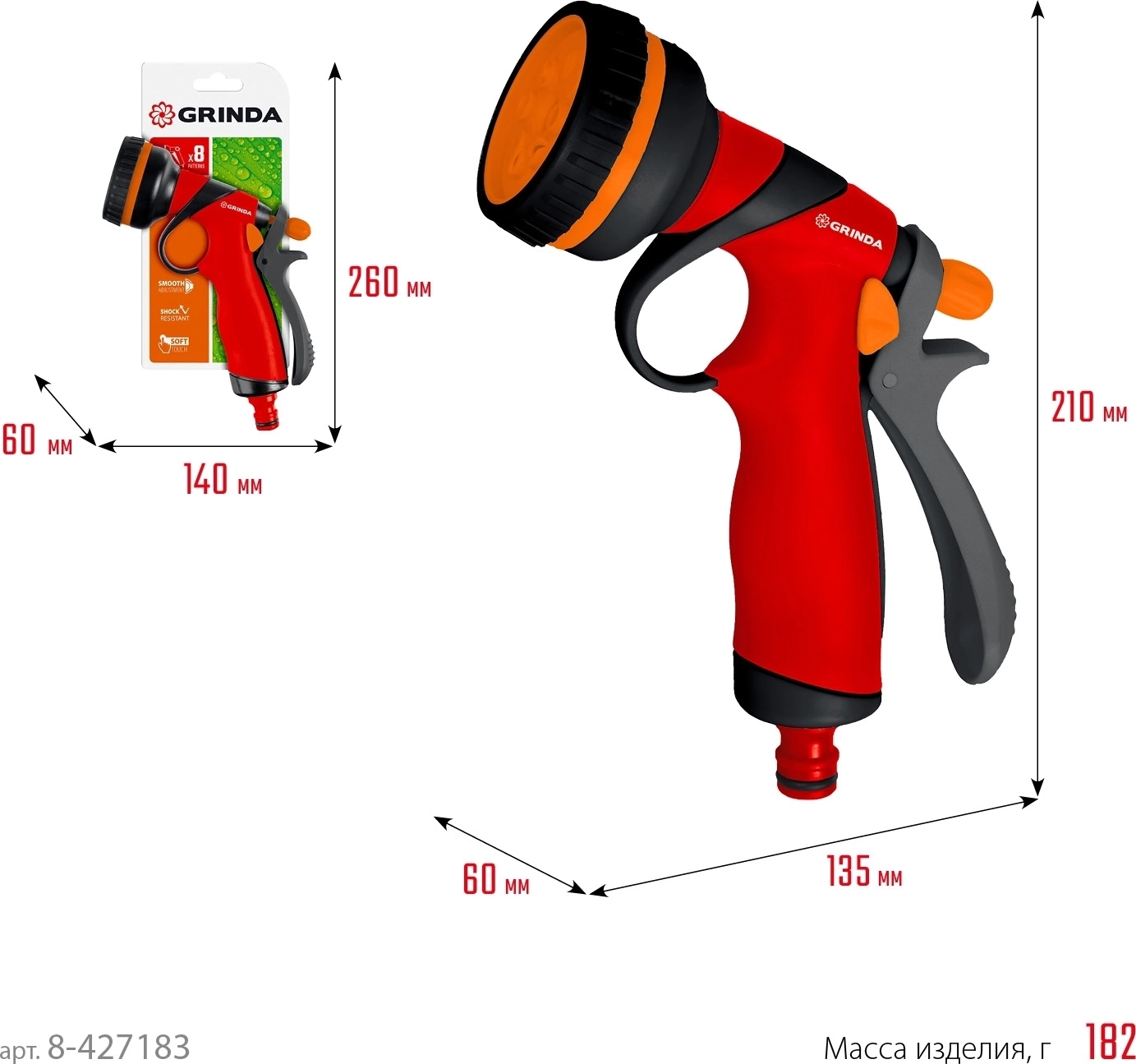 Поливочные пистолеты-распылители GRINDA удобны, надёжны и долговечны. Обеспечивают простое и качественное подключение к поливочной системе. Широкий модельный ряд с самыми современными и эффективными режимами полива.