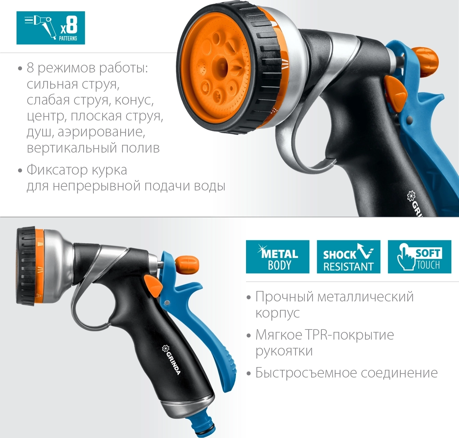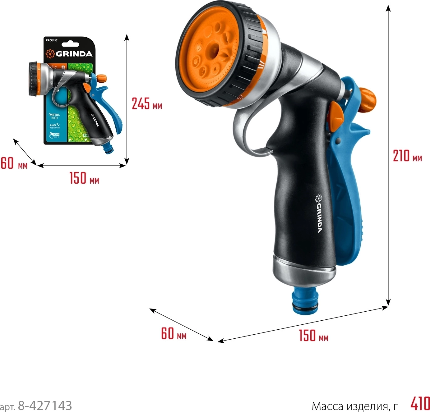Поливочный пистолет PROLine GRINDA RM-8 8 режимов курок сзади металлический с TPR