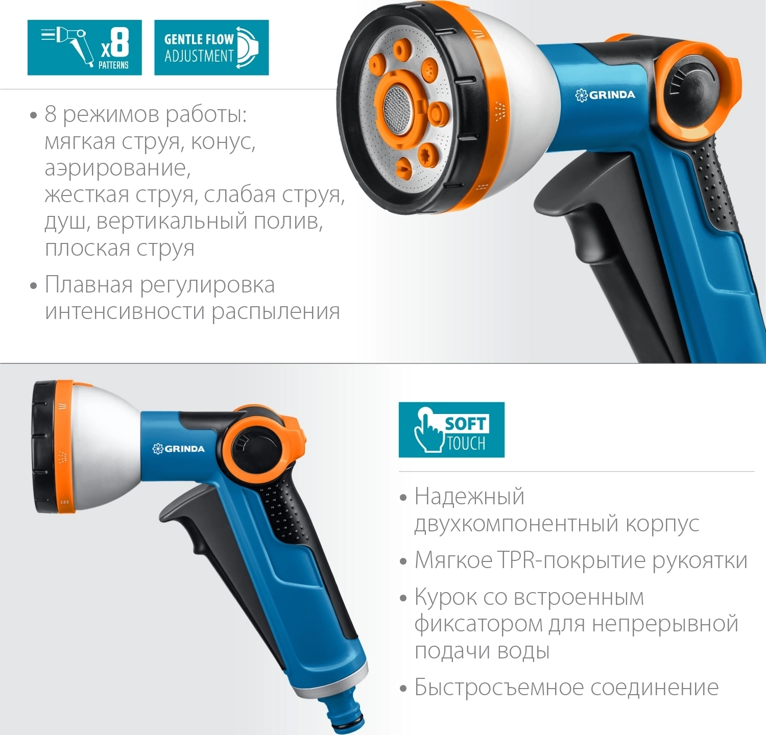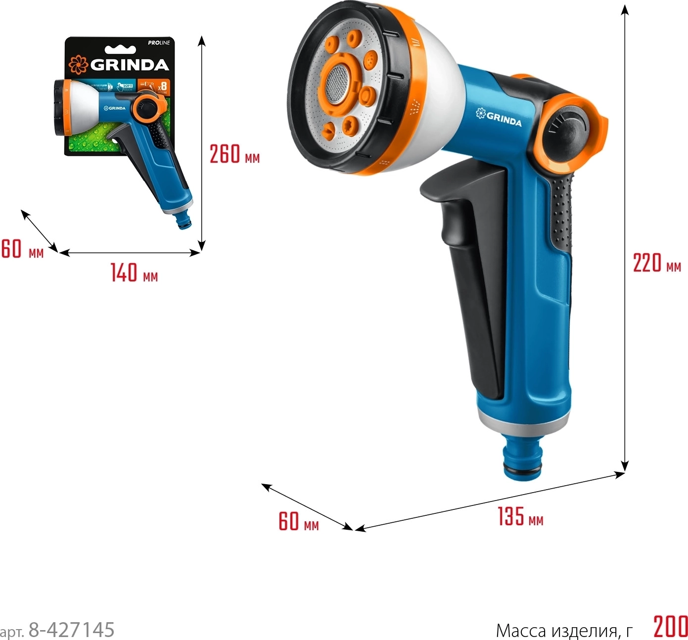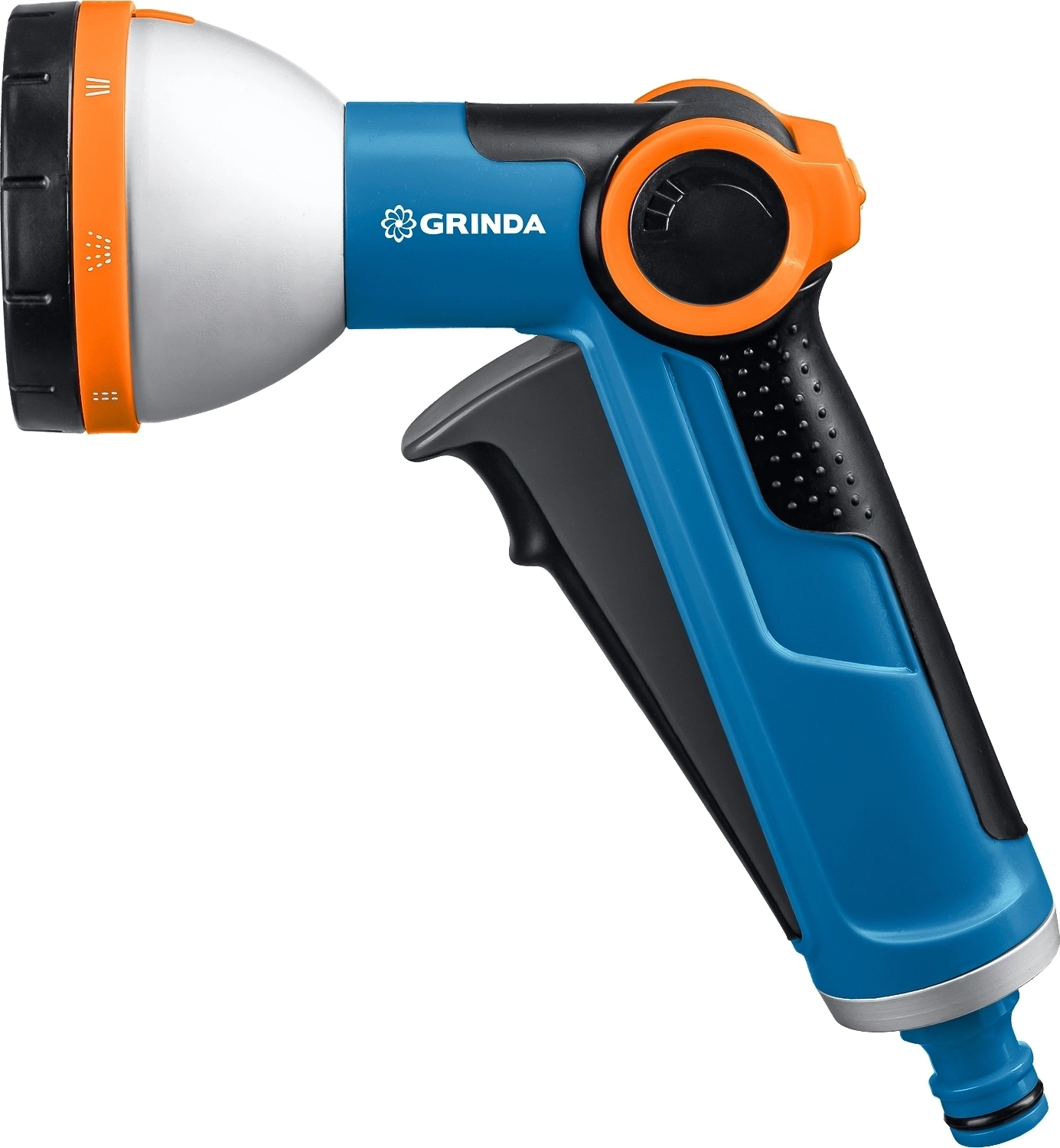 Поливочный пистолет PROLine GRINDA X-8 с регулятором напора 8 режимов курок спереди двухкомпонентный