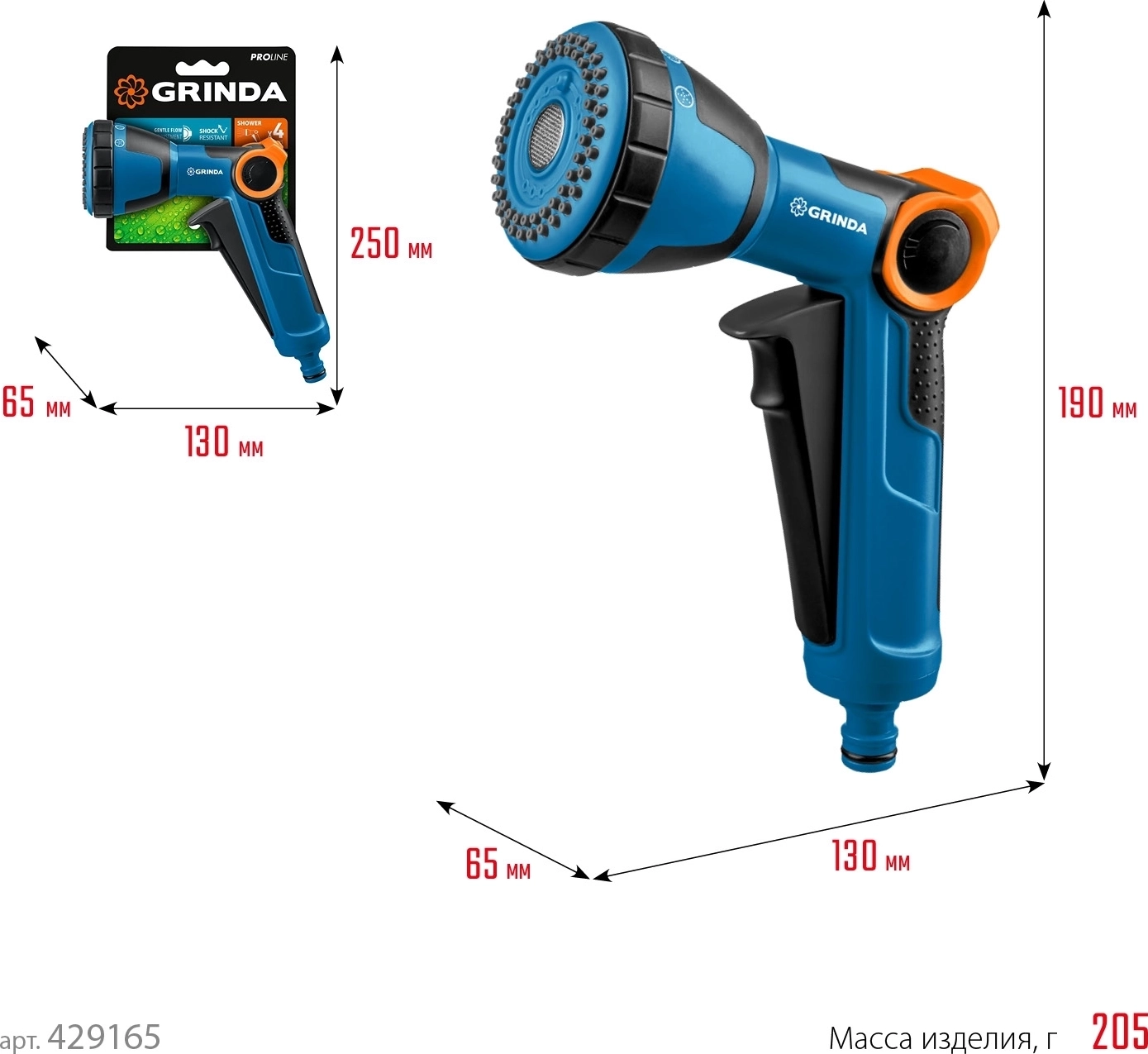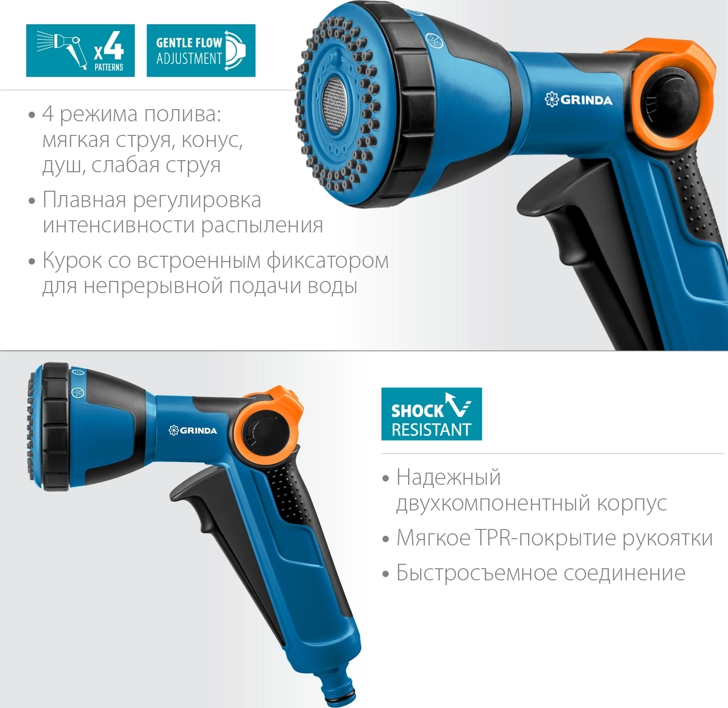 Поливочный пистолет PROLine GRINDA X-S с регулятором напора душевой 4 режима курок спереди двухкомпонентный