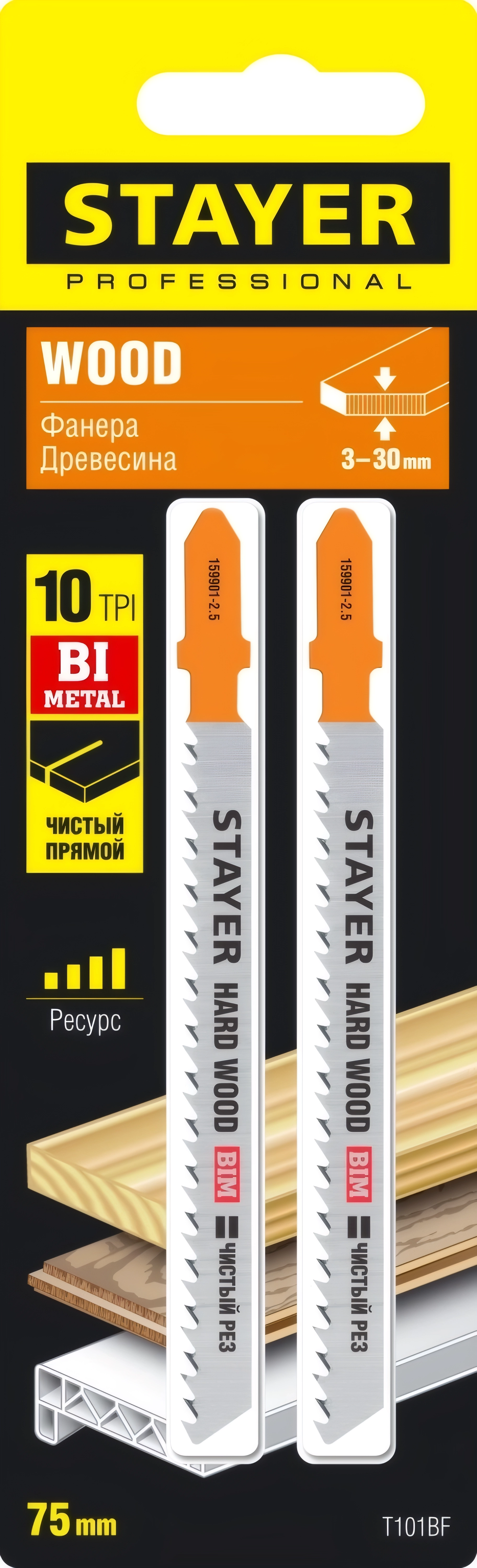 Полотна для лобзика Professional STAYER T101BF T-хвост. Bi-Metal по тверд. дереву шаг зуба 2.5 мм раб. длина 75 мм 2 шт