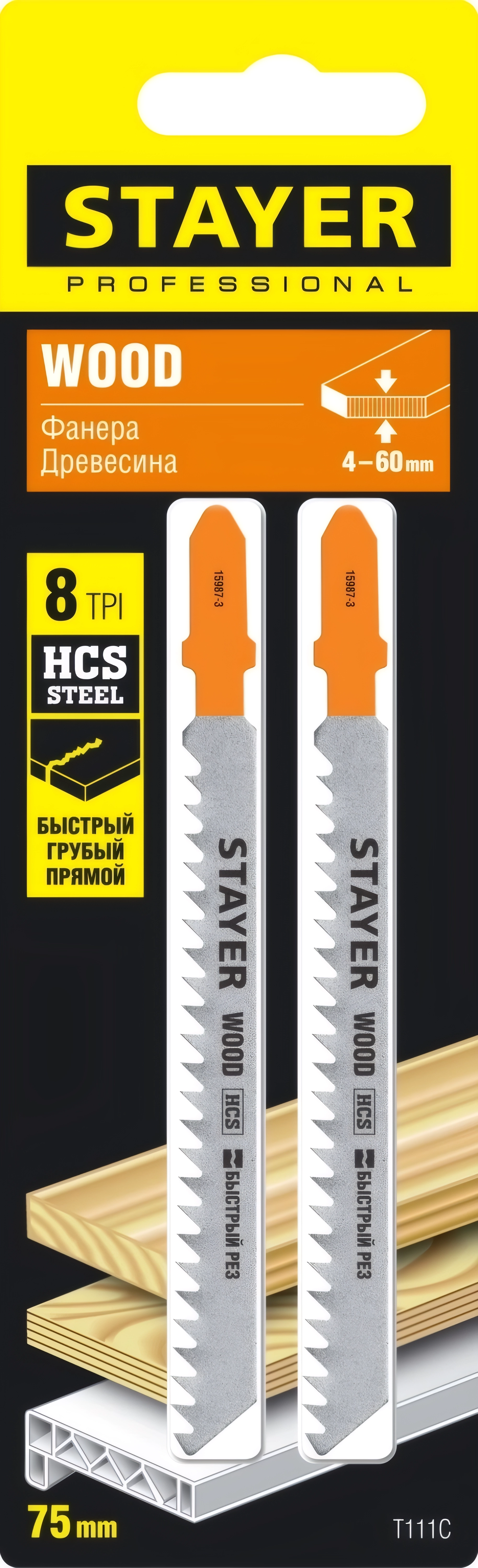 Полотна для лобзика Professional STAYER T111C T-хвост. HCS сталь по пластику/дереву/ДСП шаг зуба 3 мм (8TPI) раб. длина 75 мм 2 шт