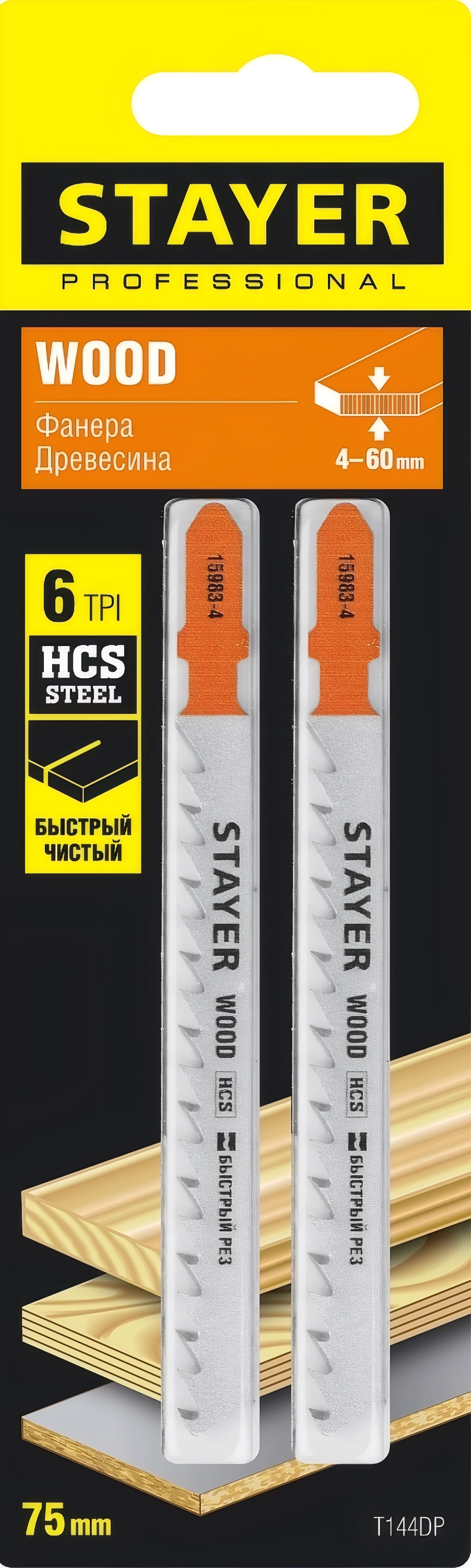 Полотна для лобзика Professional STAYER T144DP T-хвост. HCS сталь по дереву прямой рез шаг зуба 4 мм раб. длина 75 мм 2 шт