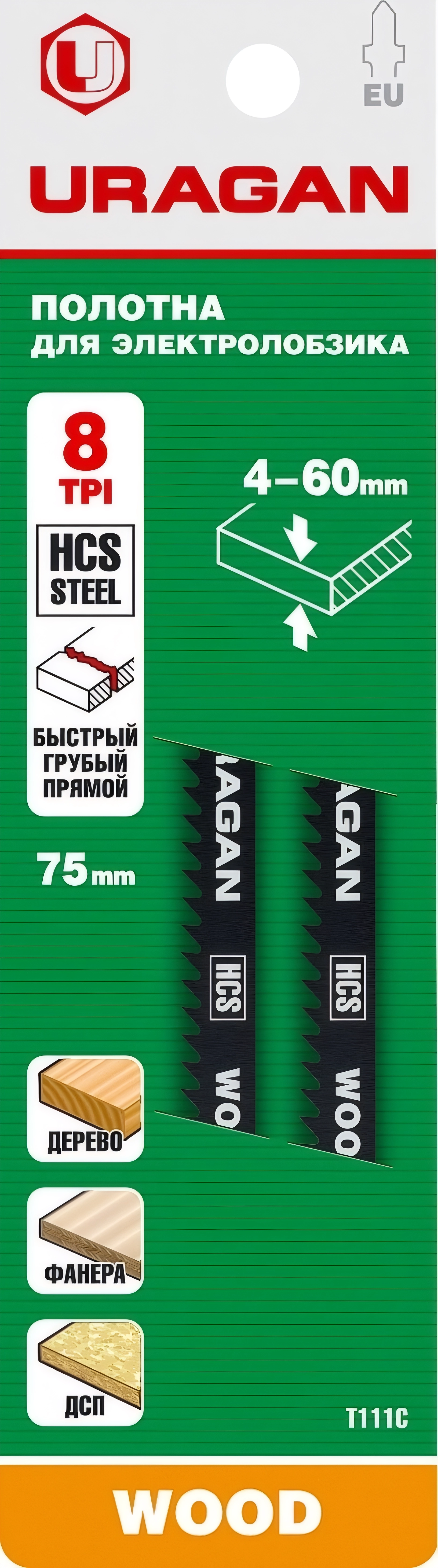 Полотна для лобзика URAGAN T111C, T-хвост., по дереву, HCS, шаг 3 мм, 75 мм, 2 шт
