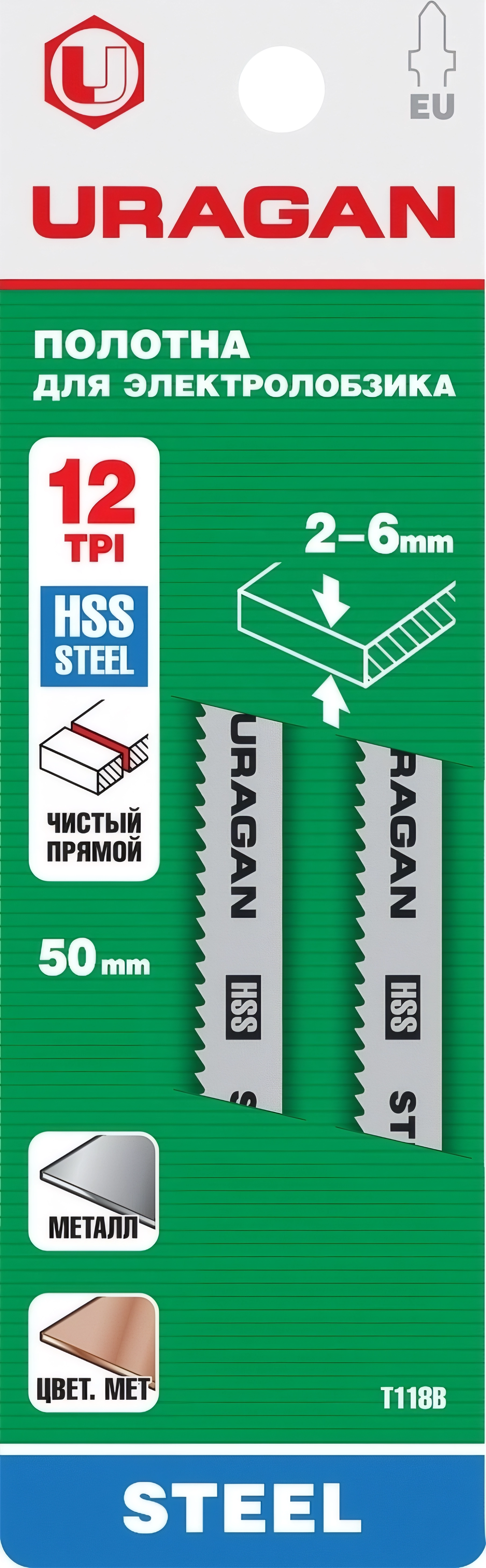 Полотна для лобзика URAGAN T118B, T-хвост., по металлу, HSS, шаг 2 мм, 50 мм, 2 шт