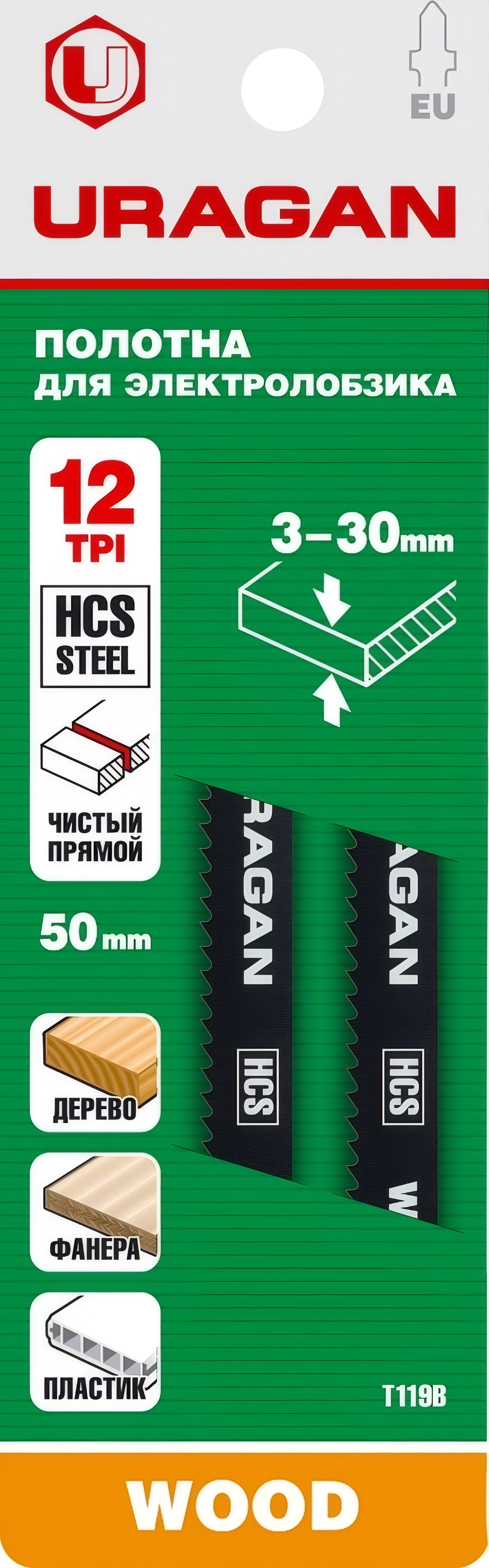 Полотна для лобзика URAGAN T119B, T-хвост., по дереву, HCS, шаг 2 мм, 50 мм, 2 шт