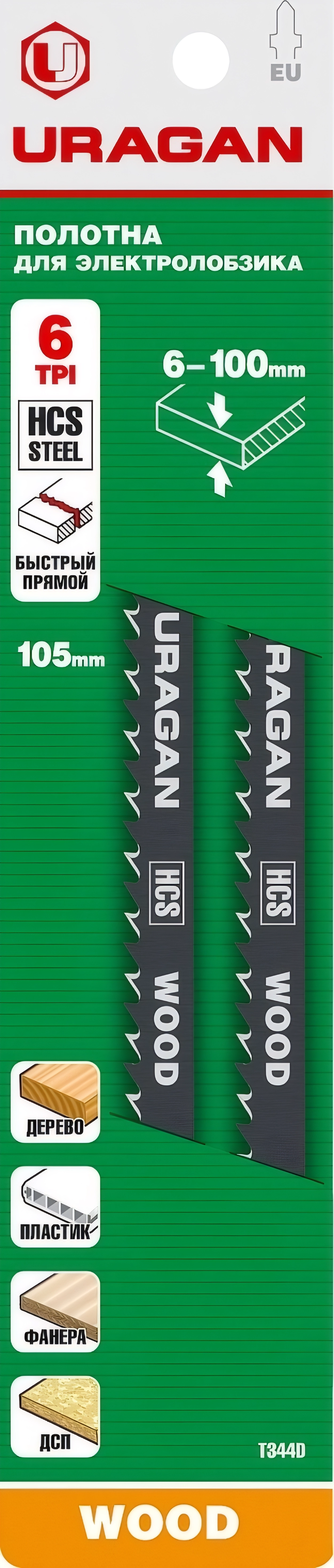 Полотна для лобзика URAGAN T344D, T-хвост., быстрый рез, HCS, шаг 4 мм, 100 мм, 2 шт