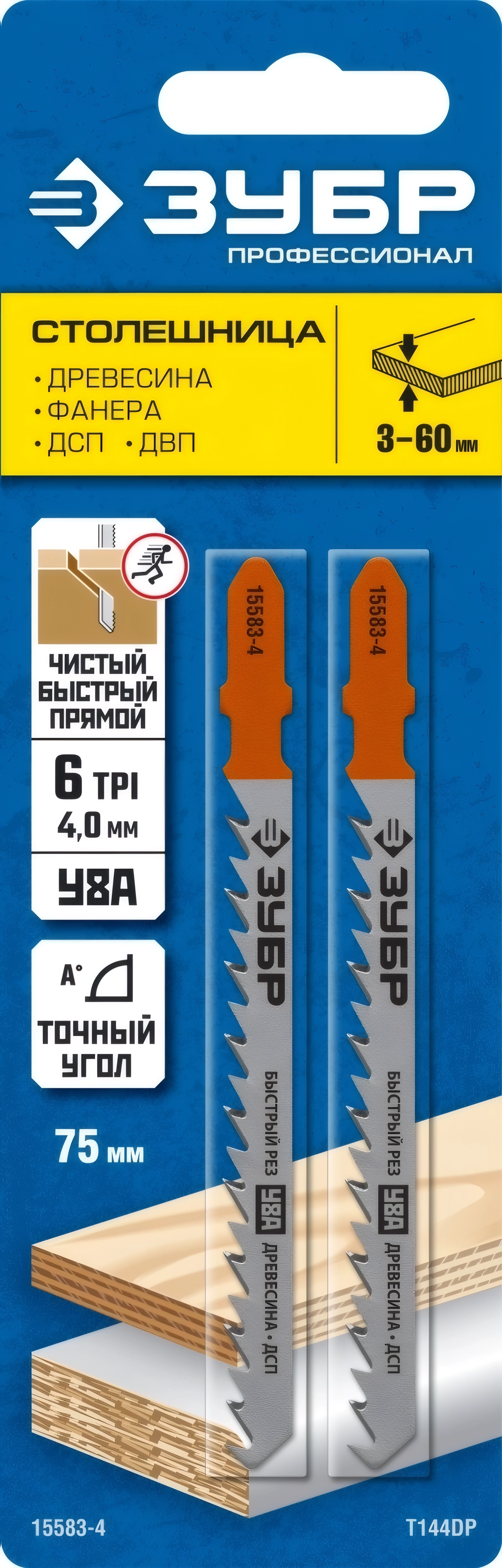 Полотна для лобзика ЗУБР T144DP T-хвост. У8А сталь по дереву шаг зуба 4 мм 6TPI раб. длина 75 мм 2 шт