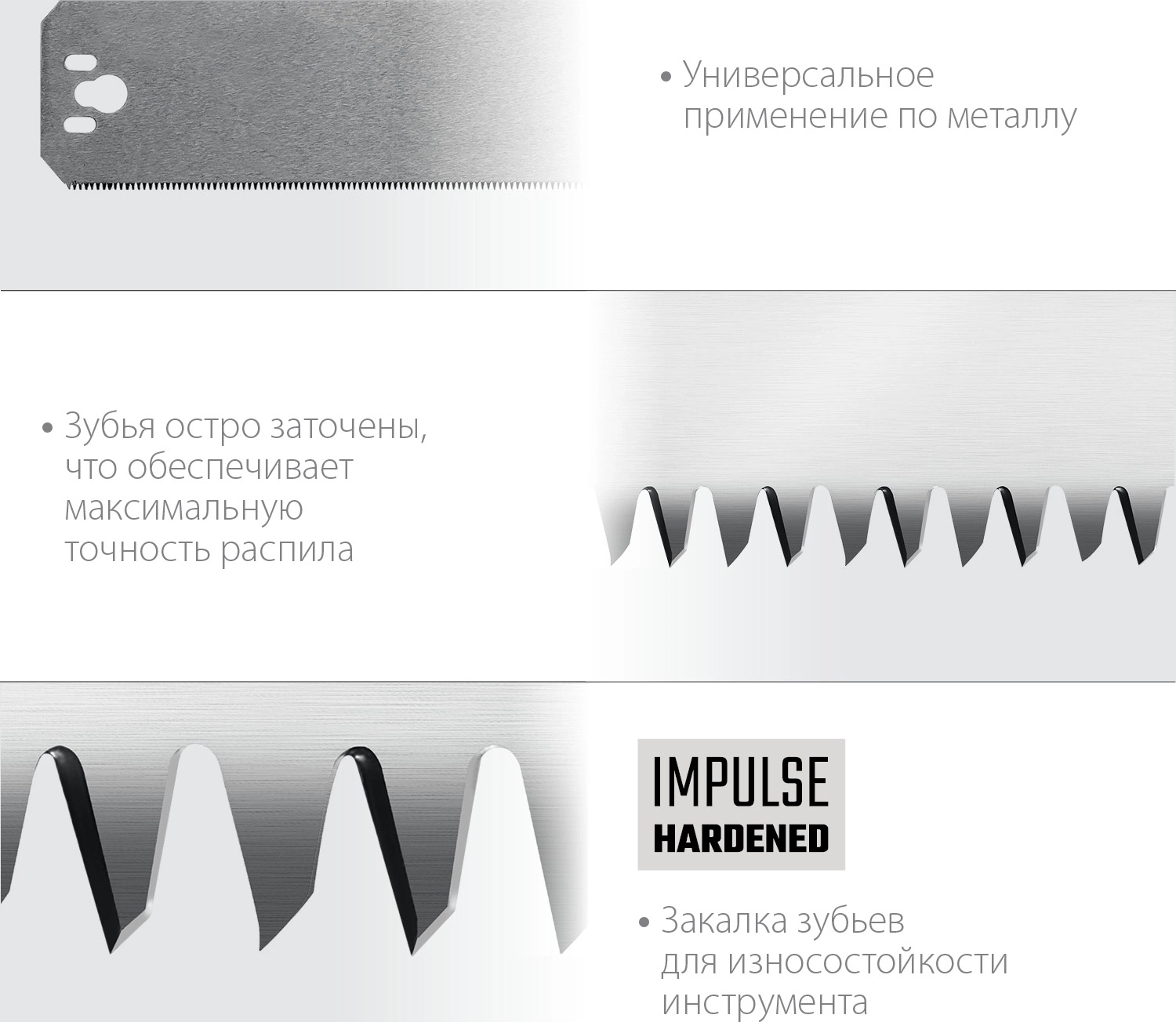 Изготовлено из высококачественной инструментальной стали. Зубья полотна остро заточены и подвергнуты многоуровневой закалке.