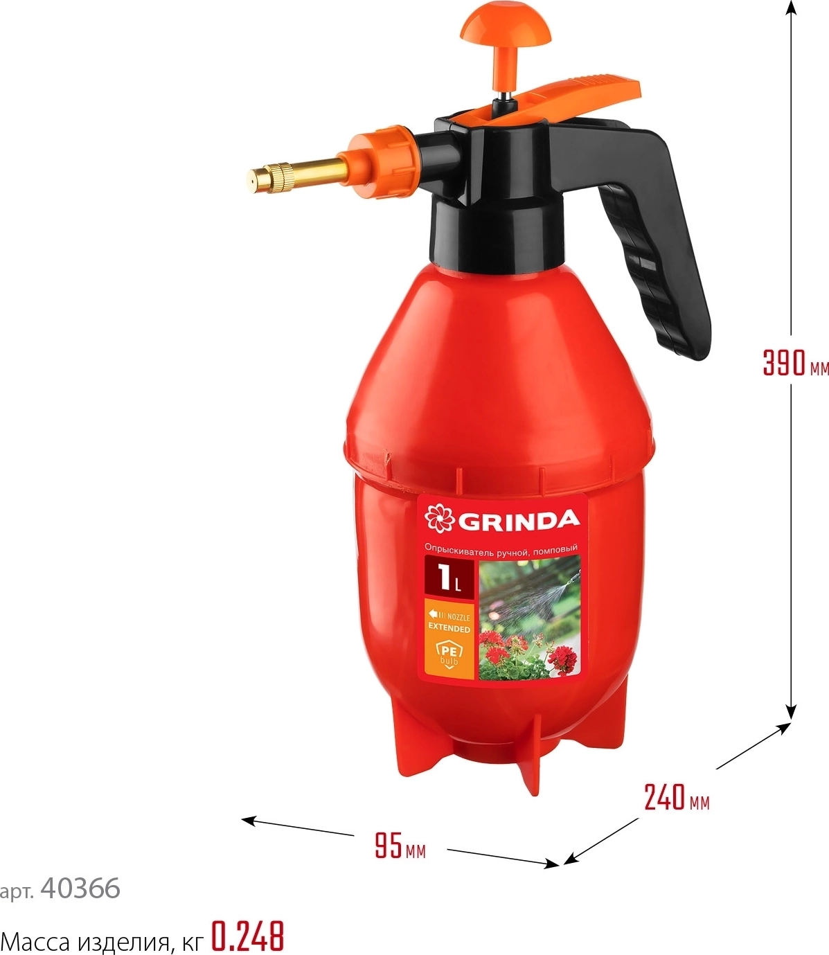 Помповый опрыскиватель GRINDA PS-1E, объем 1 л, ручной, с удлинённым соплом, колба из полиэтилена