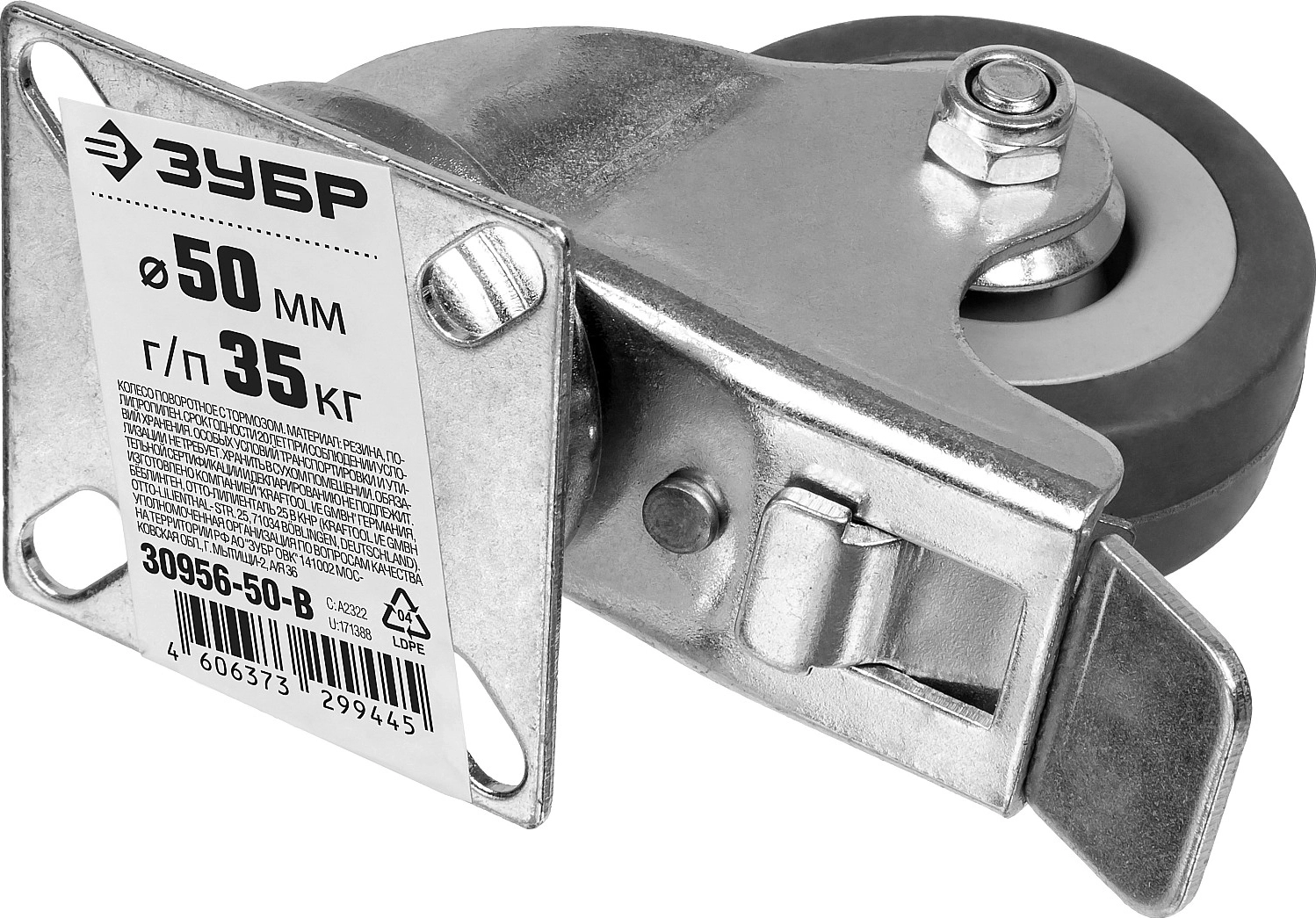 Поворотное колесо c тормозом ЗУБР d 50 мм, г/п 35 кг, резина/полипропилен