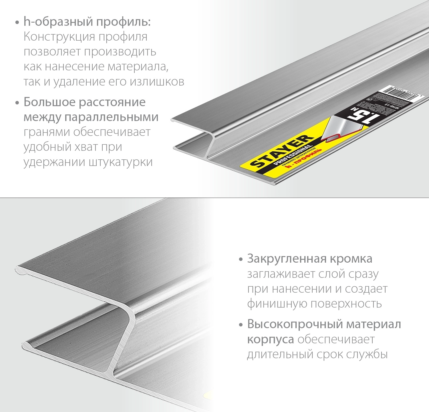 Прочность и удобство – основные достоинства правил STAYER. Конструкция профиля позволяет производить как нанесение материала, так и удаление его излишков.