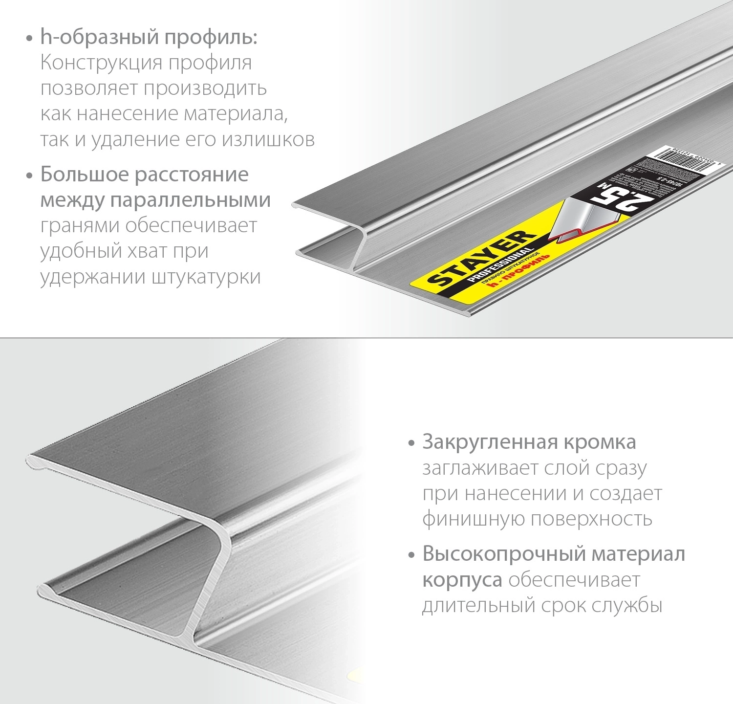 Прочность и удобство – основные достоинства правил STAYER. Конструкция профиля позволяет производить как нанесение материала, так и удаление его излишков.
