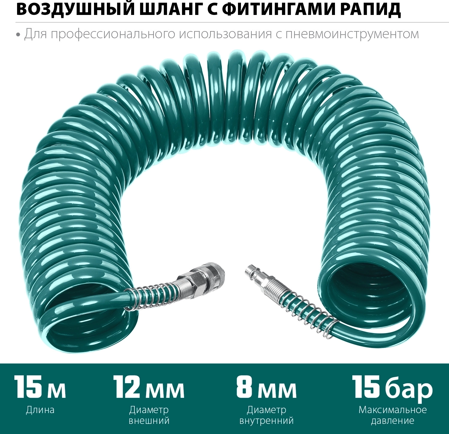 Воздушный спиральный шланг с фитингами рапид 15 м, 8 х 12 мм, 15 бар арт. 112382