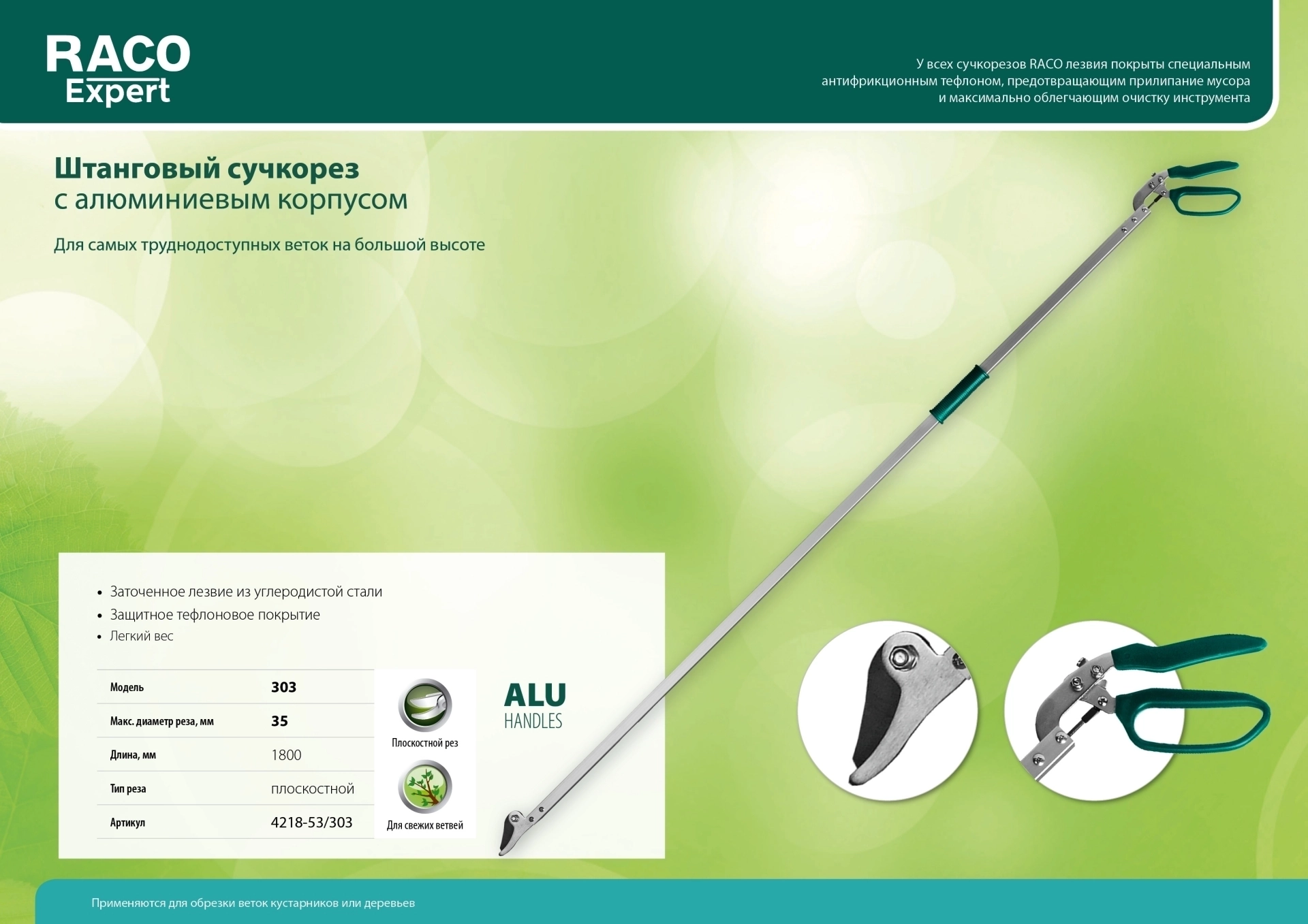 Плоскостной сучкорез RACO 303, 1800 мм, закаленные лезвия, тефлоновое покрытие, штанговый, алюминиевые ручки