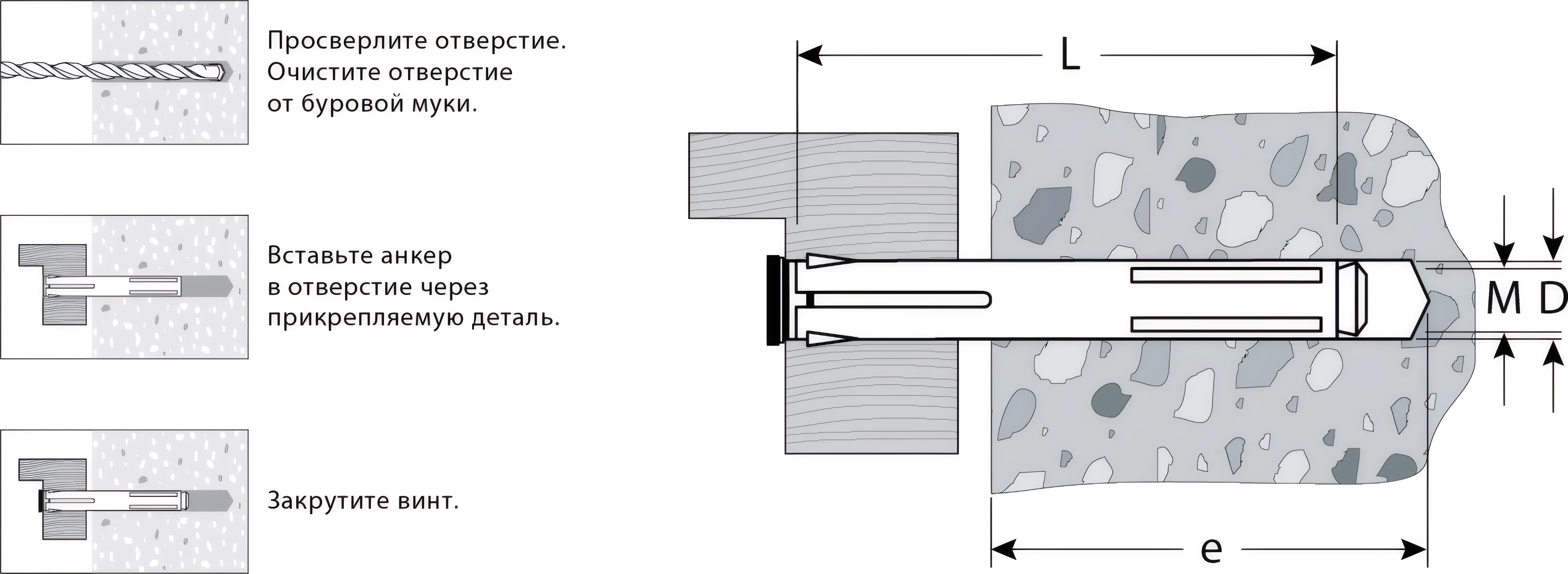 Для крепления оконных рам и дверных коробок к полнотелым основаниям: поверхностям из бетона, полнотелого кирпича или природного камня. Анкер устанавливается в предварительно просверленное и очищенное от буровой муки отверстие, расклинивание происходит при закручивании винта. Минимальная глубина анкеровки - 30мм. Минимальная глубина сверления (е) - 50мм. Для установки анкера требуется бита PZ3.