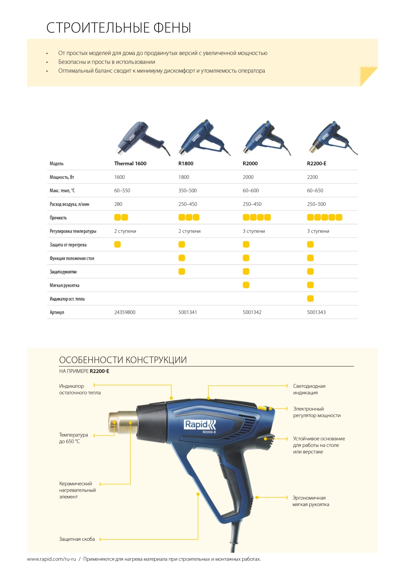 R1800 это простой, без излишеств, технический фен, специально созданная для таких работ, как размораживание, вощение лыж и сноубордов, удаление травы с мощеных дорог и множества других повседневных задач дома, во дворе или в гараже. Обладая мощностью 1800 Вт, двумя температурными режимами (300 °C и 550 °C) и регулируемым расходом воздуха, R1800 выполняет работу быстро и точно. Он также имеет защиту рукоятки, повышая безопасность пользователя и обеспечивая спокойную работу.