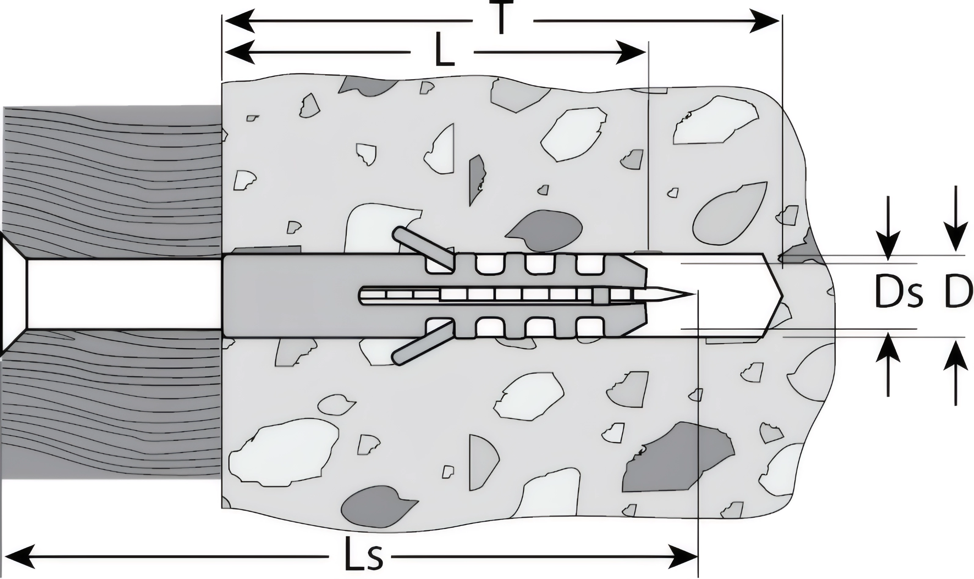 Для монтажа элементов и конструкций к полнотелым строительным материалам (бетон, кирпич, природный камень). Фиксация дюбеля происходит при вкручивании в него самореза (входит в комплект поставки). Диаметр предварительного сверления: 5 мм.