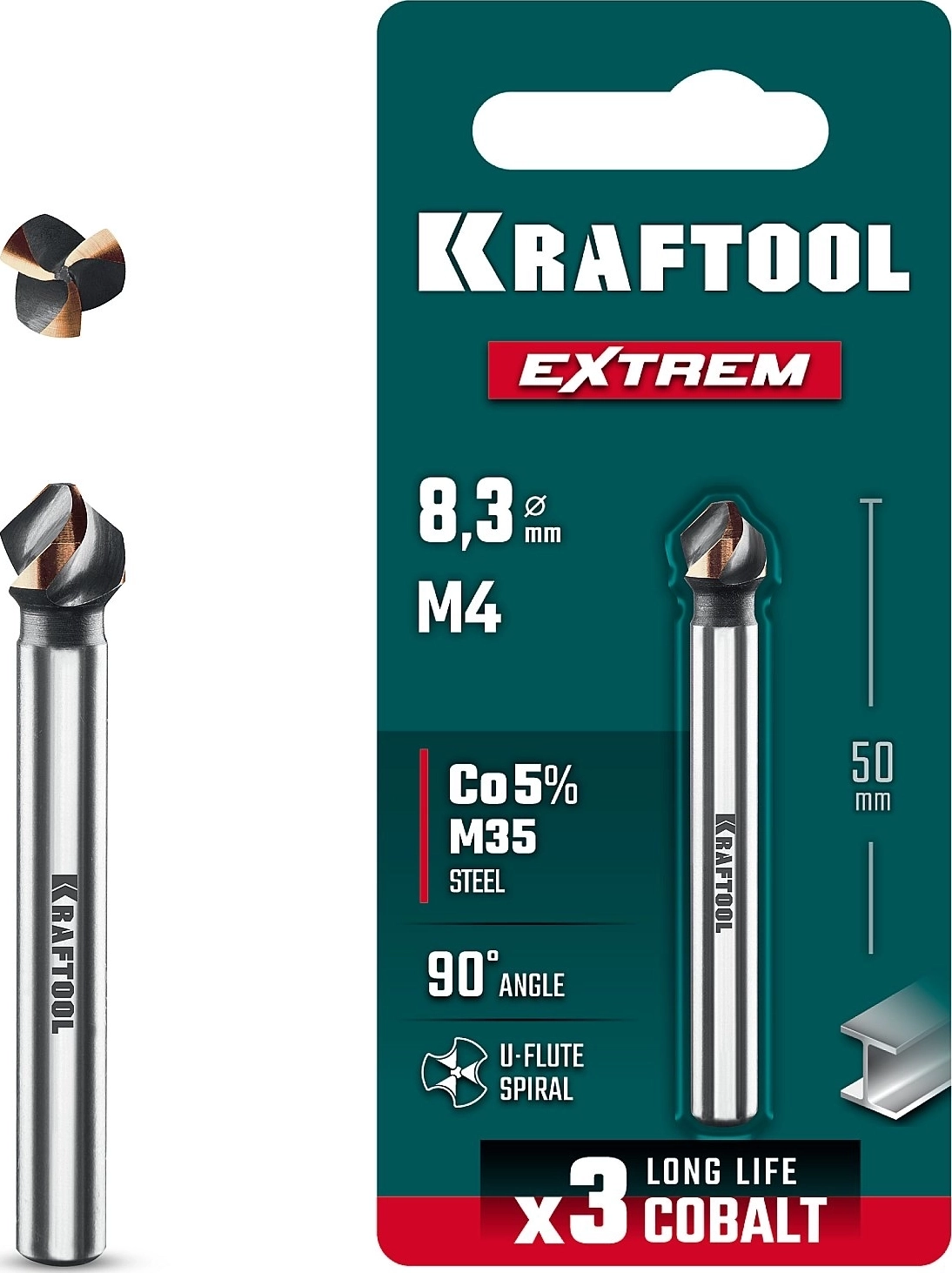 Конусный зенкер EXTREME Со5-А, d 8.3 х 50 мм, сталь M35, U-образная спираль, для раззенковки М4 арт. 119977