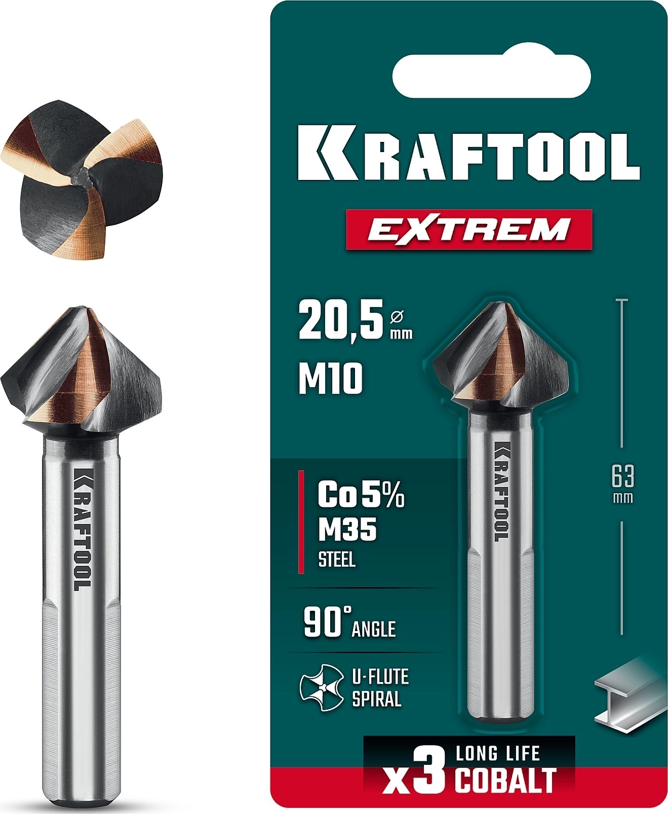 Конусный зенкер EXTREME Со5-А, d 20.5 х 63 мм, сталь M35, U-образная спираль, для раззенковки М10 арт. 119975