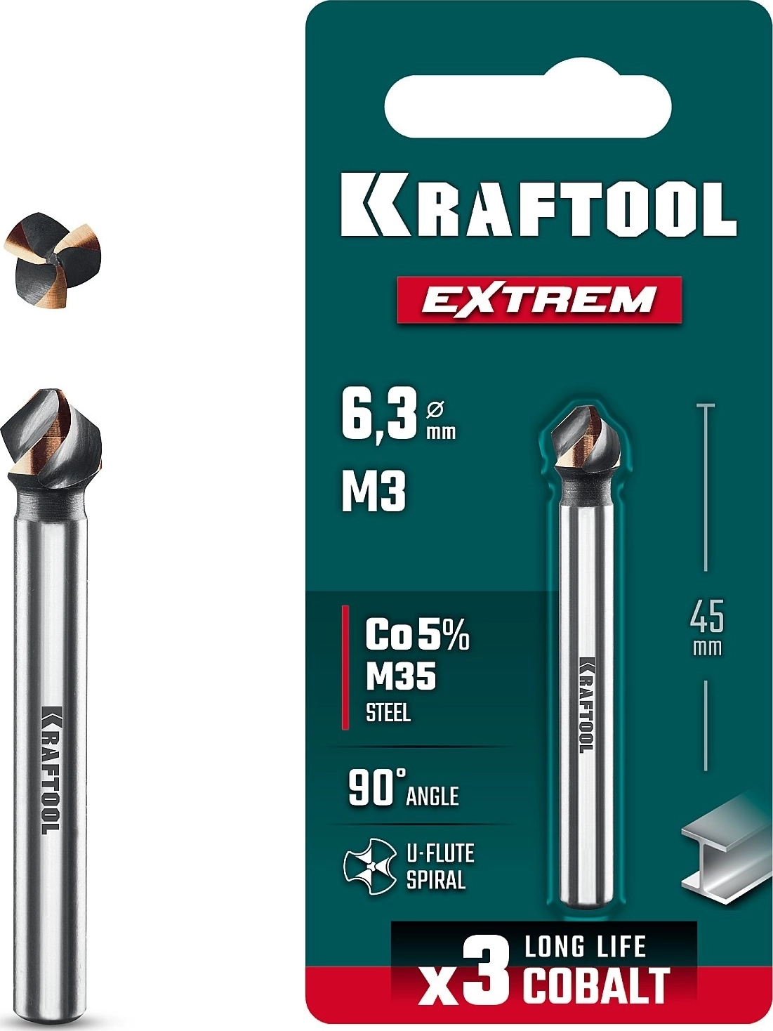 Конусный зенкер EXTREME Со5-А, d 6.3 x 45 мм, сталь M35, U-образная спираль, для раззенковки М3 арт. 119976