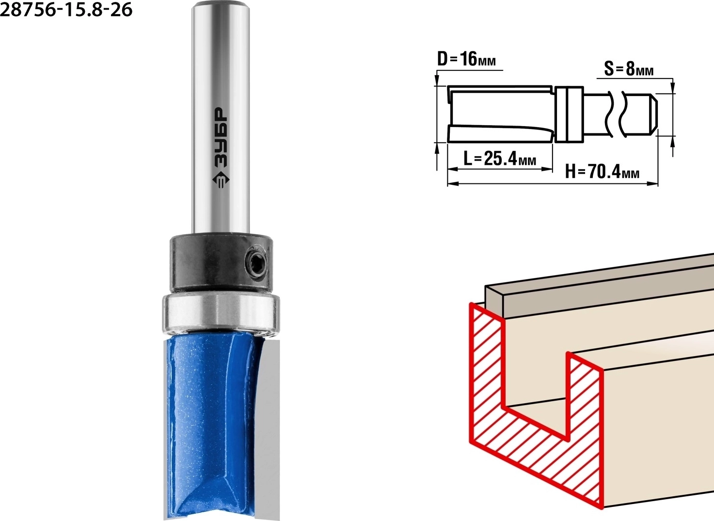 Фреза пазовая прямая с верхним подшипником 15.8 x 25.4 мм хвостовик 8 мм арт. 102320