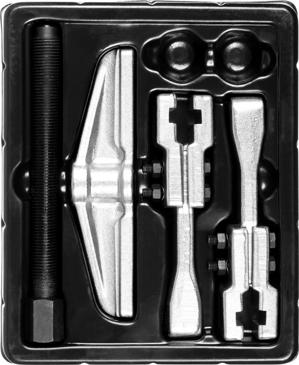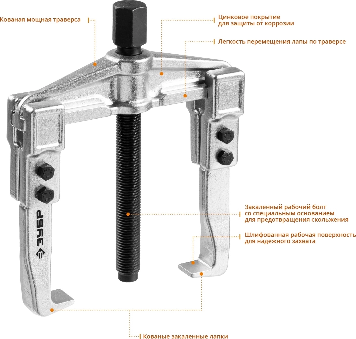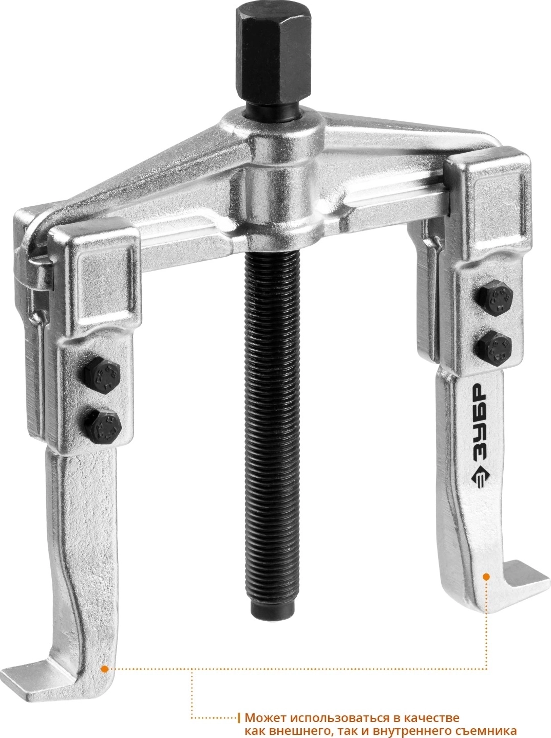 Захваты съемника выкованы из качественной инструментальной стали, что обеспечивает долгий срок службы при работе с высокими нагрузками. Позволяет работать с широким рядом узлов