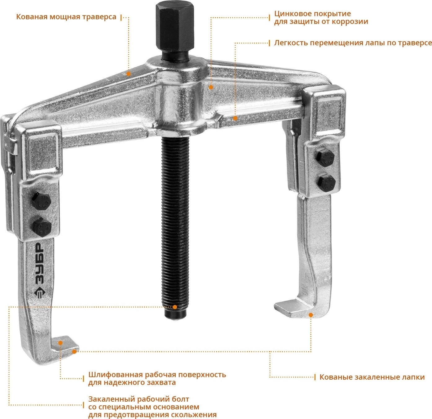 Захваты съемника выкованы из качественной инструментальной стали, что обеспечивает долгий срок службы при работе с высокими нагрузками. Позволяет работать с широким рядом узлов