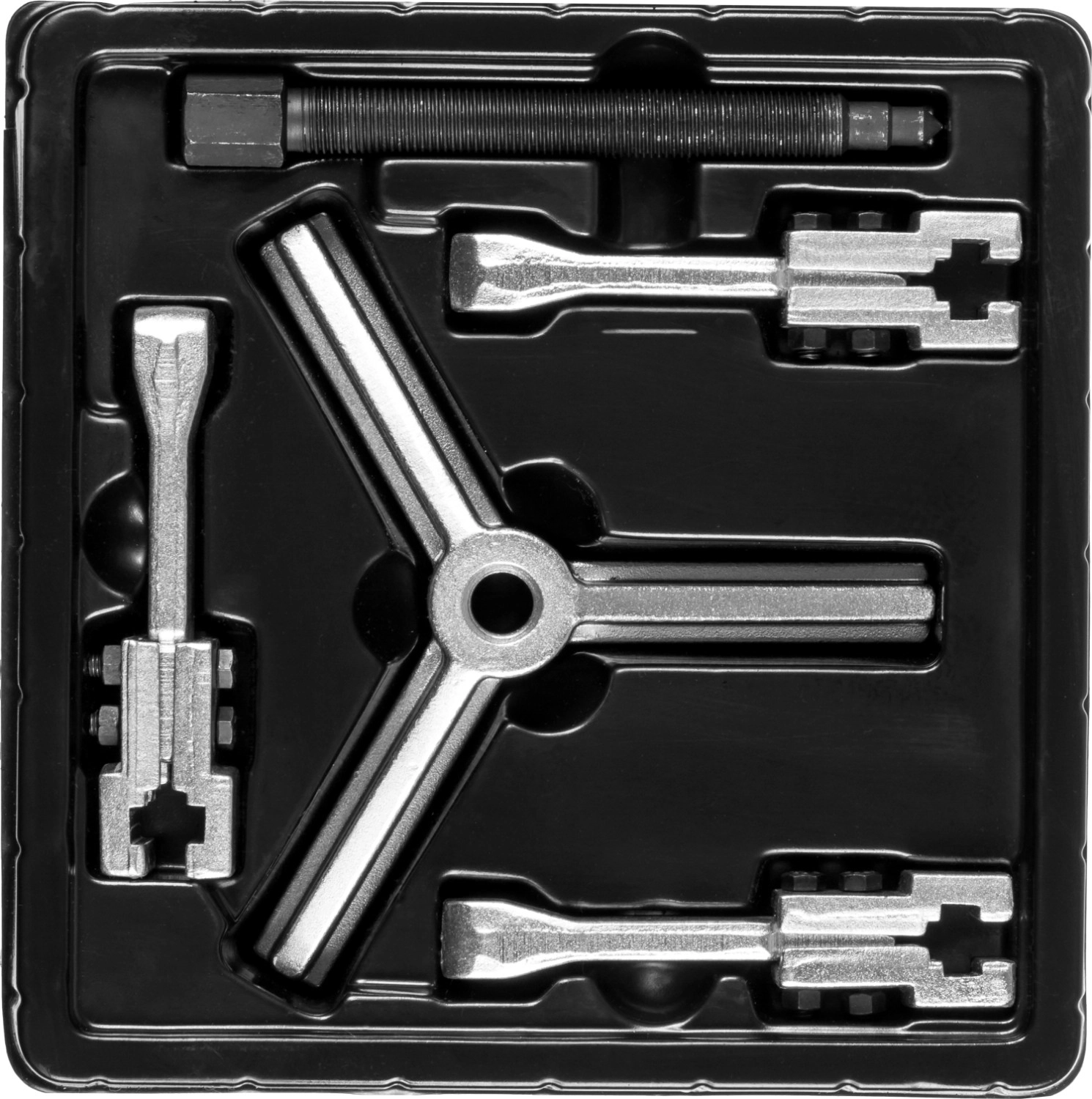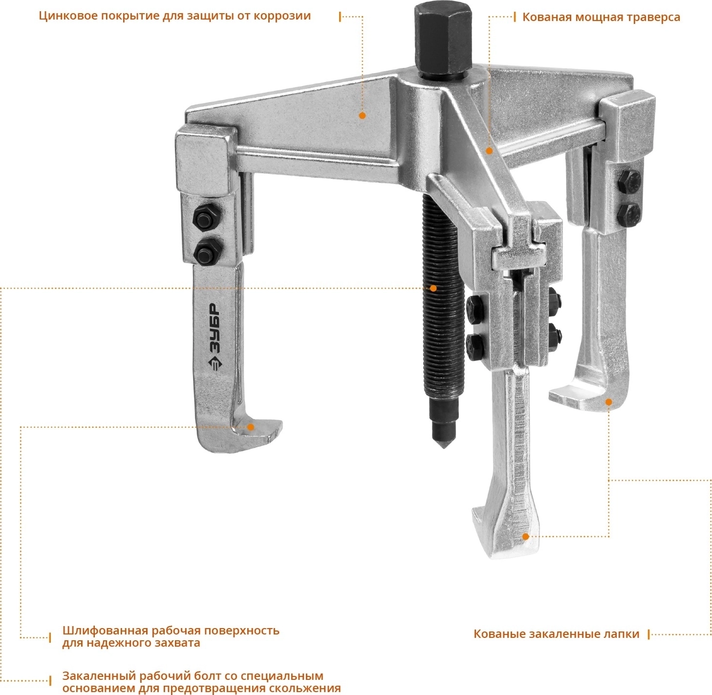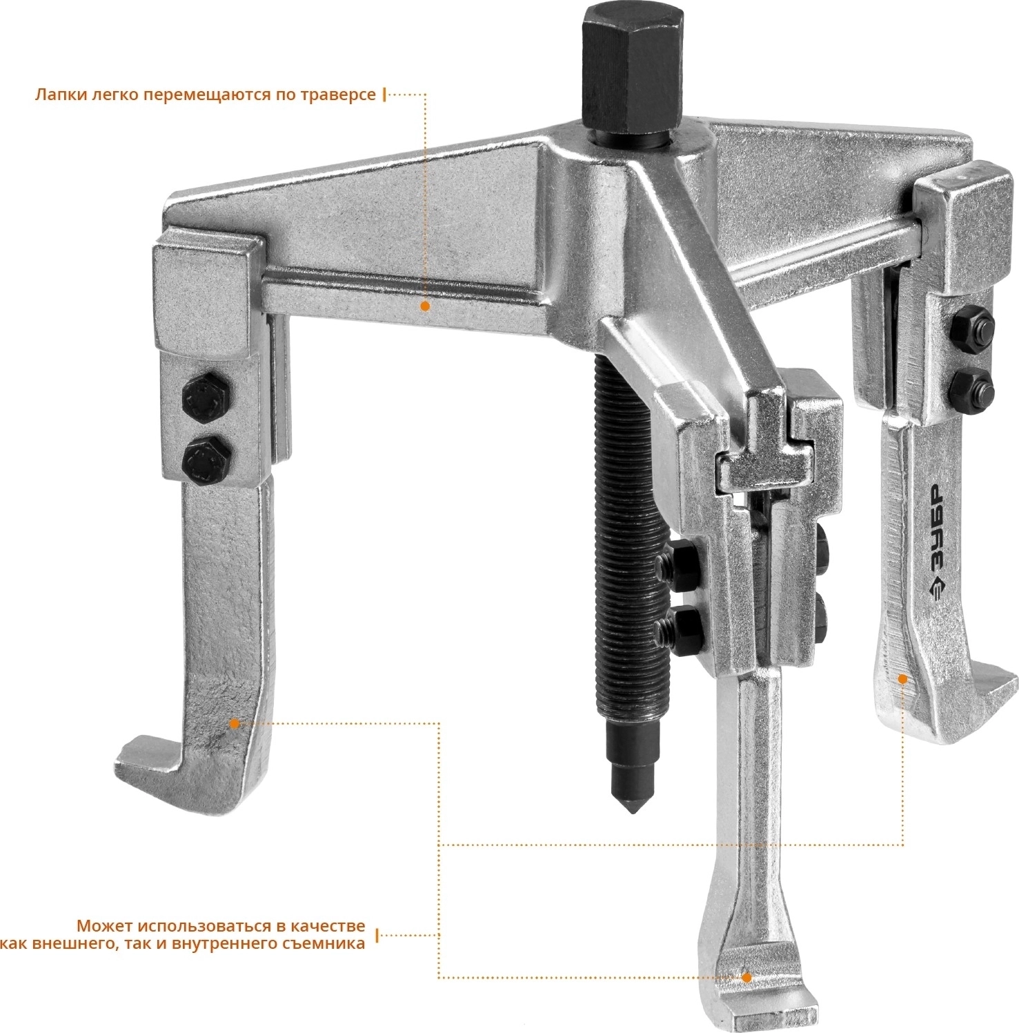 Захваты съемника выкованы из качественной инструментальной стали, что обеспечивает долгий срок службы при работе с высокими нагрузками. Позволяет работать с широким рядом узлов