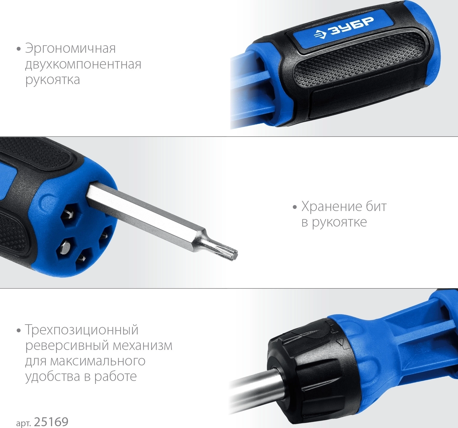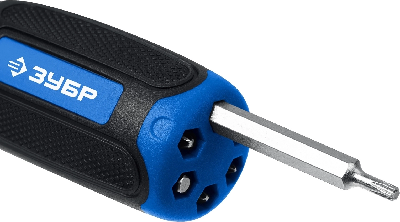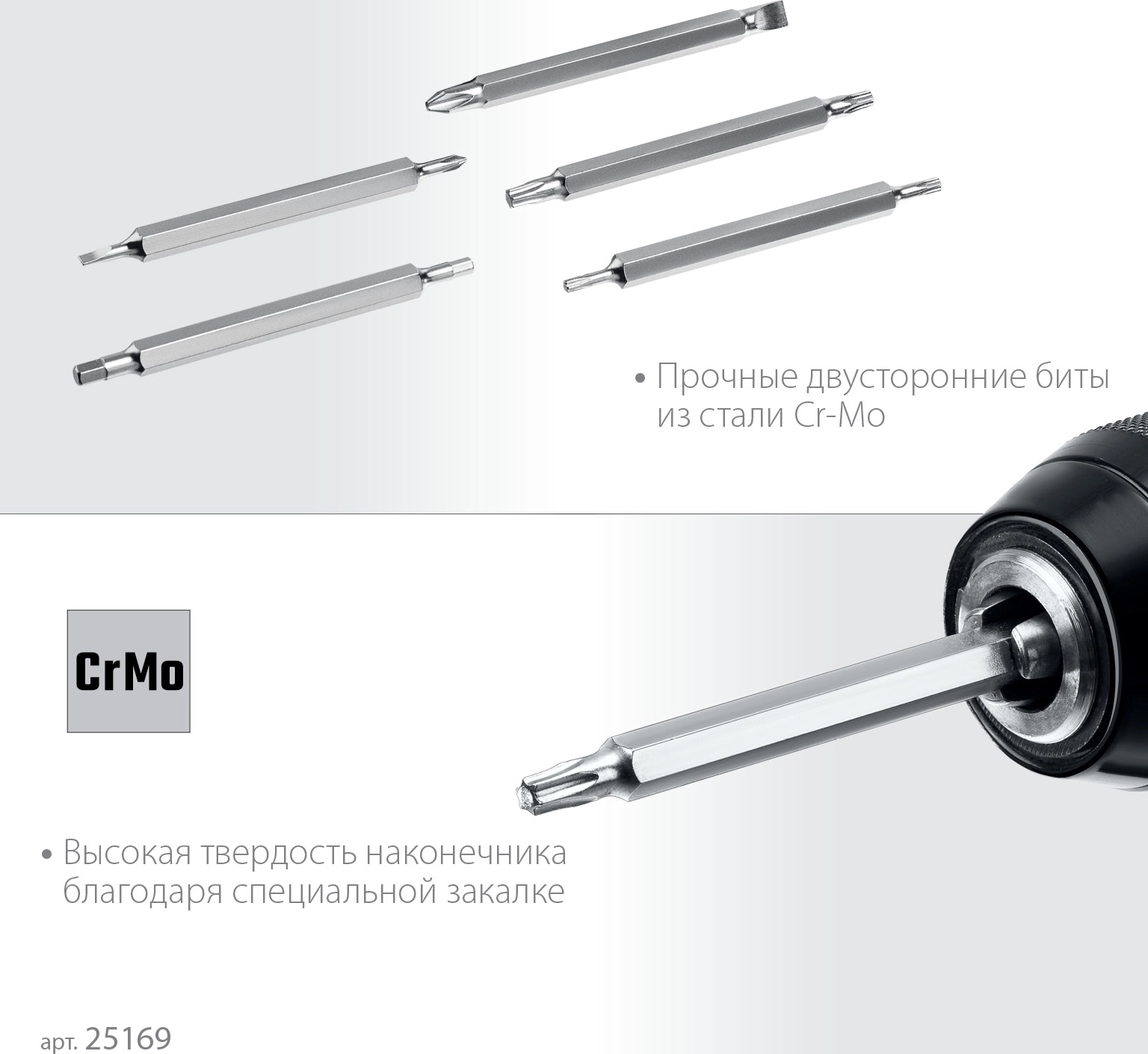 Реверсивная отвертка с двухсторонними переставными стрежнями выдерживает высокие нагрузки, благодаря высокой твердости наконечника и специальной закалке. Хранение стержней в рукоятке позволяет всегда иметь готовую к работе отвертку под рукой