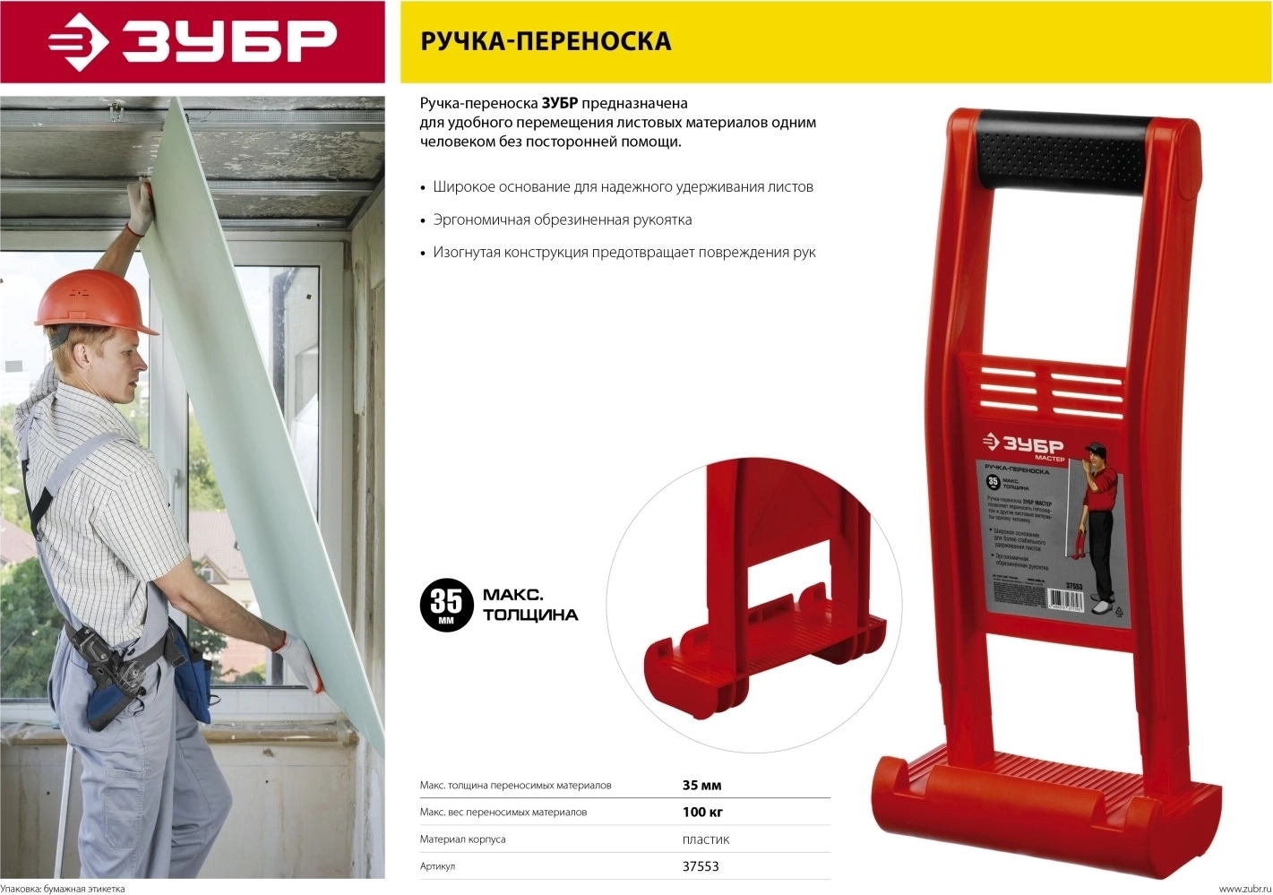 Ручка переноска ЗУБР ″МАСТЕР″ для переноски гипсокартона и других листовых материалов одним человеком