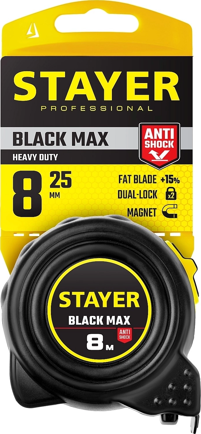 Рулетка с двумя фиксаторами Professional STAYER BlackMax 8 м х 25 мм