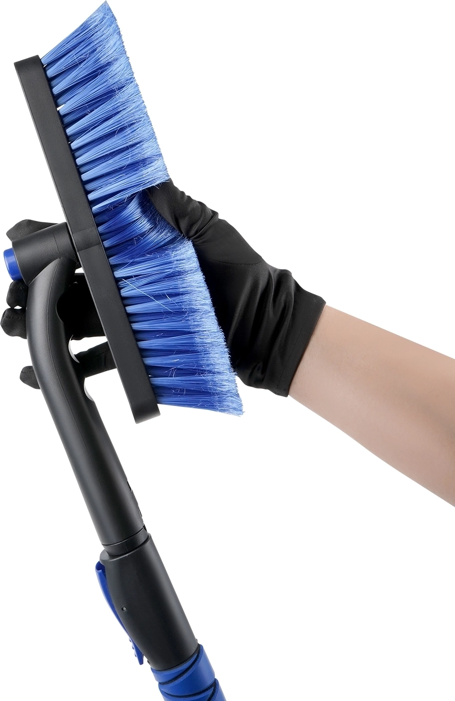 Выдвижная рукоятка позволит легко добраться до труднодоступных мест. Насадка щетки поворотная. Мягкий, прочный ворс не повредит покрытие кузова автомобиля.