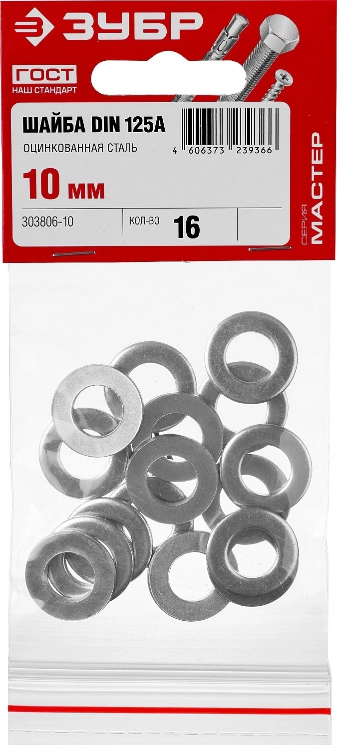 Шайба ЗУБР DIN 125А, 10 мм, цинк, 16 шт
