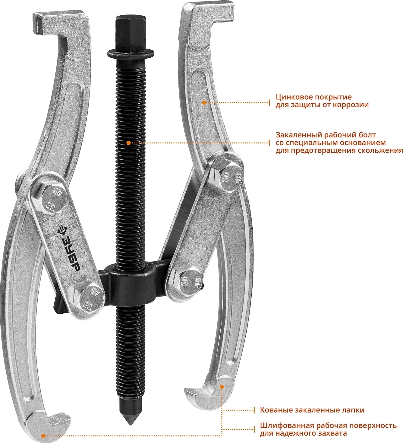 Захваты съемника выкованы из качественной инструментальной стали, что обеспечивает долгий срок службы при работе с высокими нагрузками. Позволяет работать с широким рядом узлов