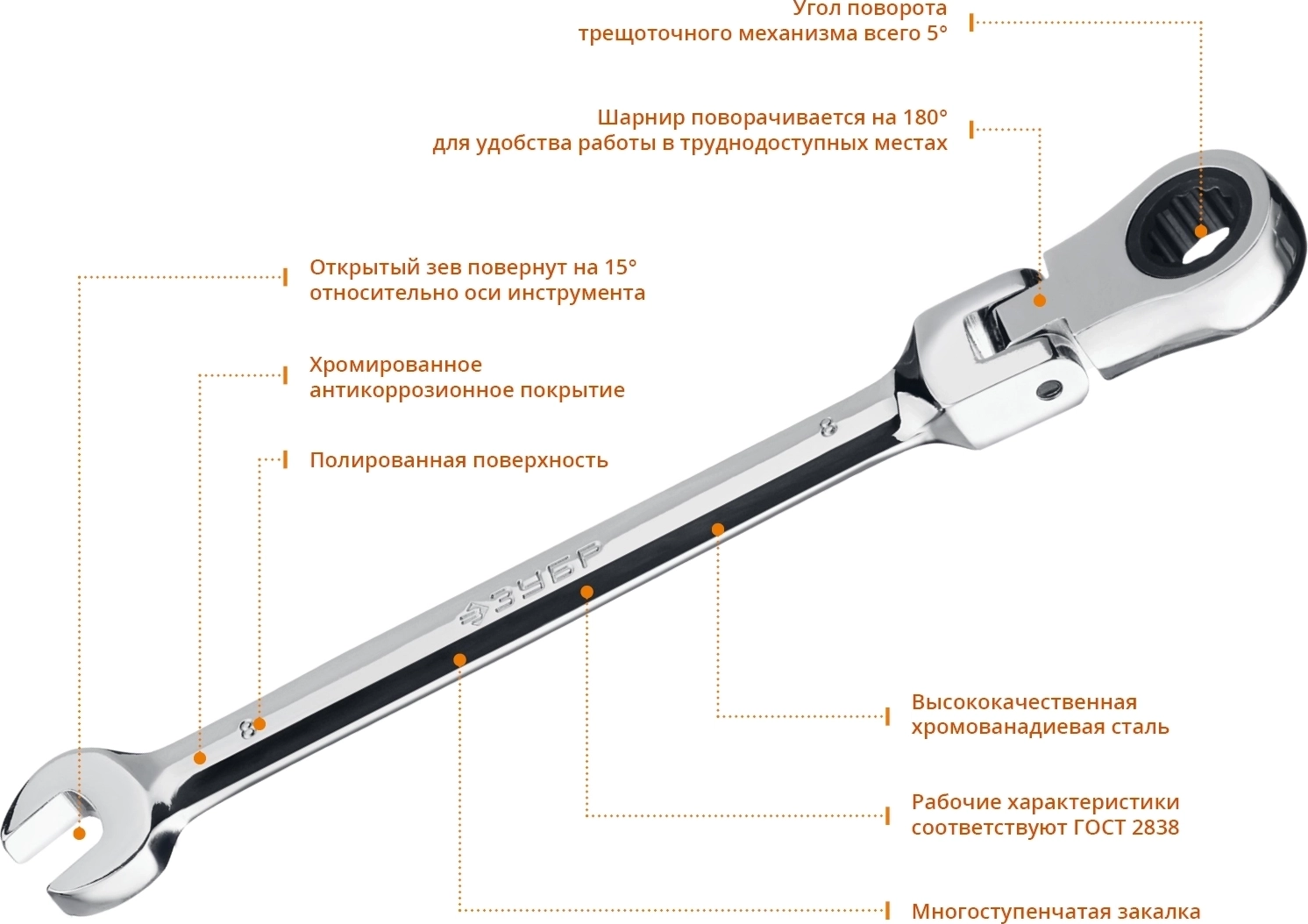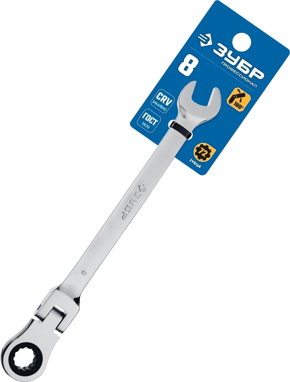 Шарнирный трещоточный гаечный ключ ЗУБР 8 мм