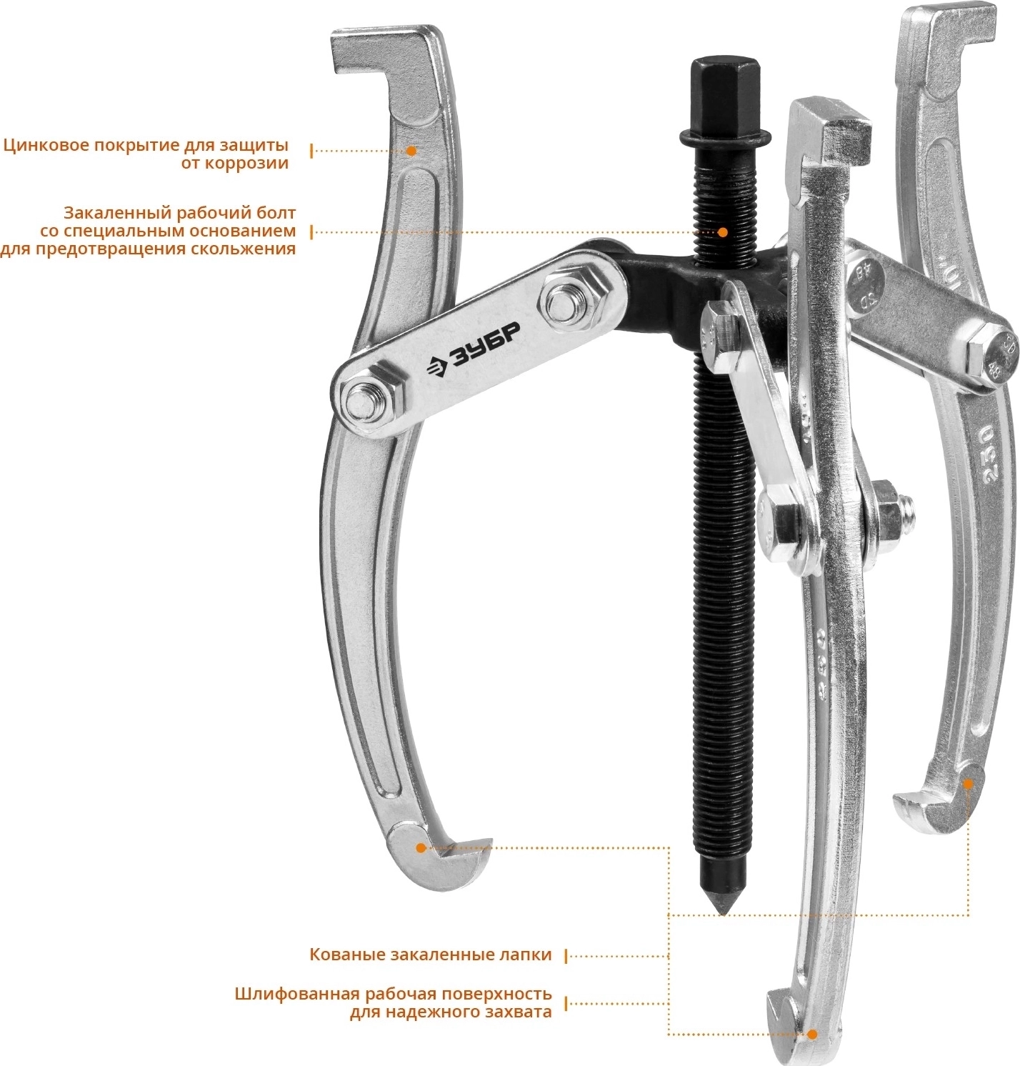 Захваты съемника выкованы из качественной инструментальной стали, что обеспечивает долгий срок службы при работе с высокими нагрузками. Позволяет работать с широким рядом узлов