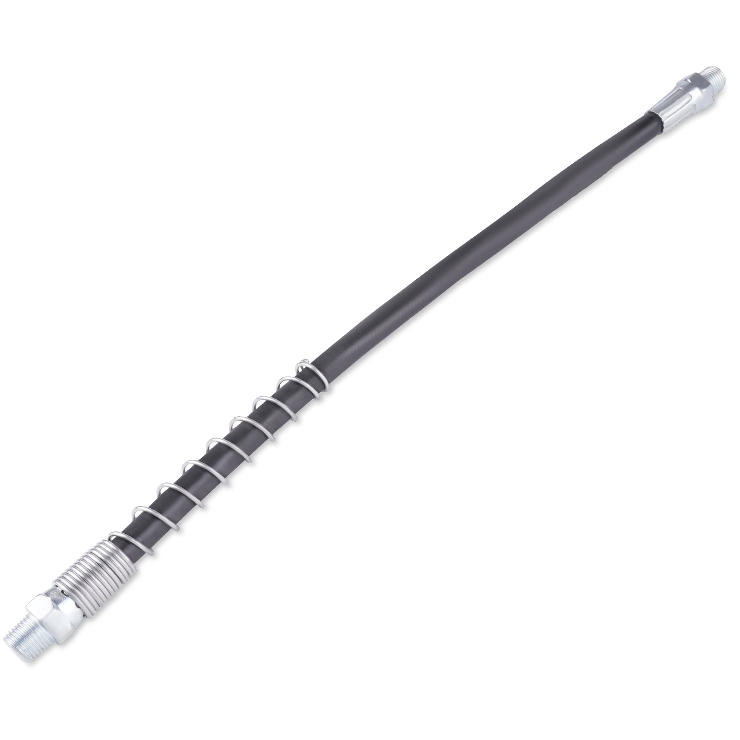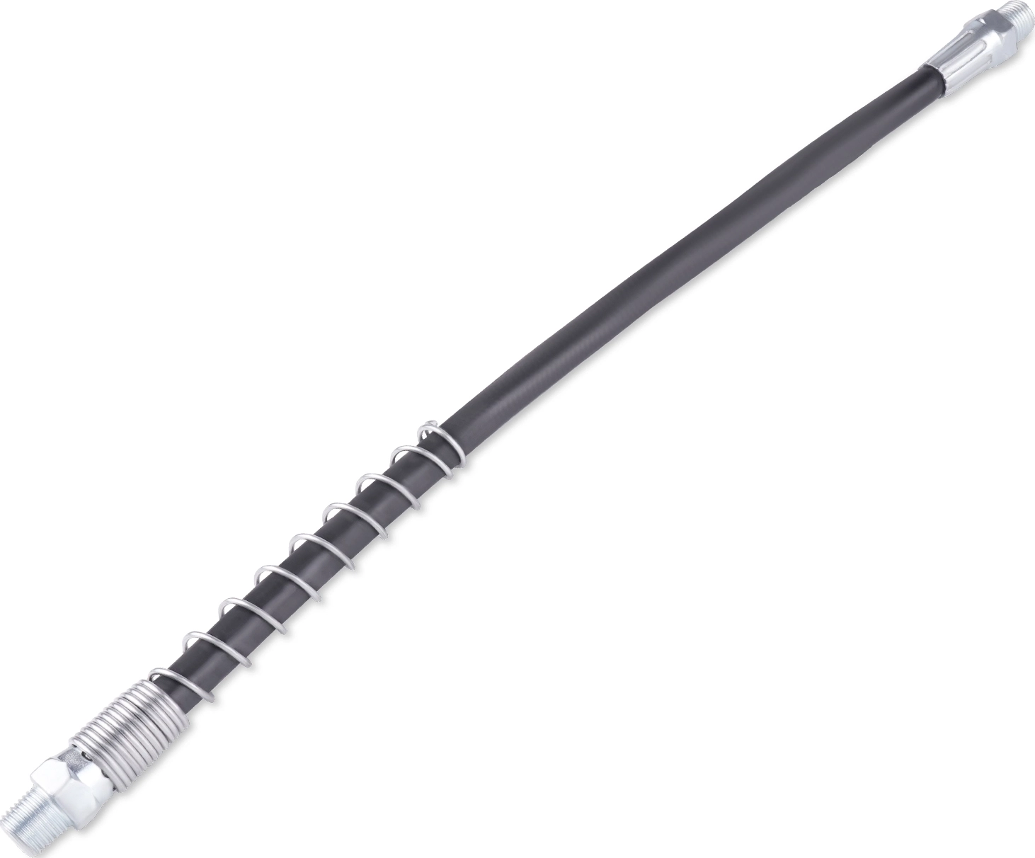 Предназначен для соединения смазочного шприца с насадкой плунжерного шприца. За счет гибкости помогает обеспечивать более удобную подачу смазочного материала к деталям механизма где применение жесткой трубки не возможно. Усиленная конструкция с защитной пружиной обеспечивает большее максимальное давление.