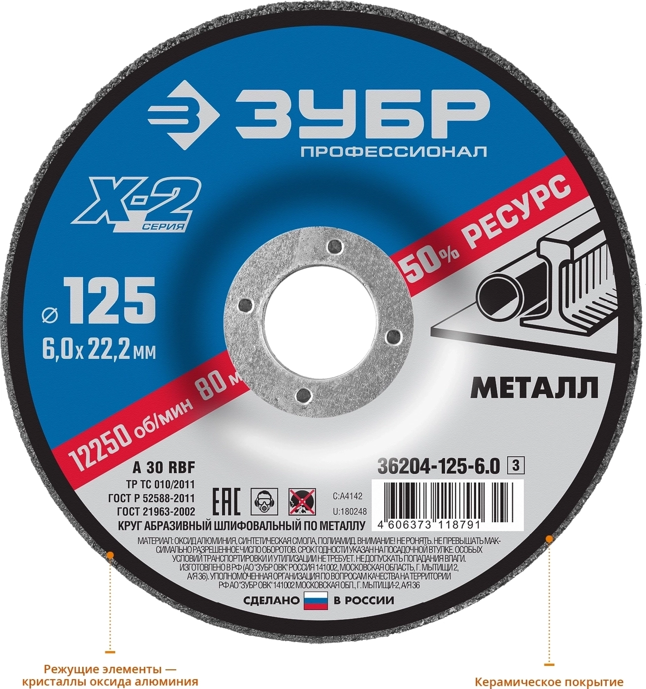 Шлифовальный круг по металлу ЗУБР Х-2 125 х 6 х 22.2 мм для УШМ